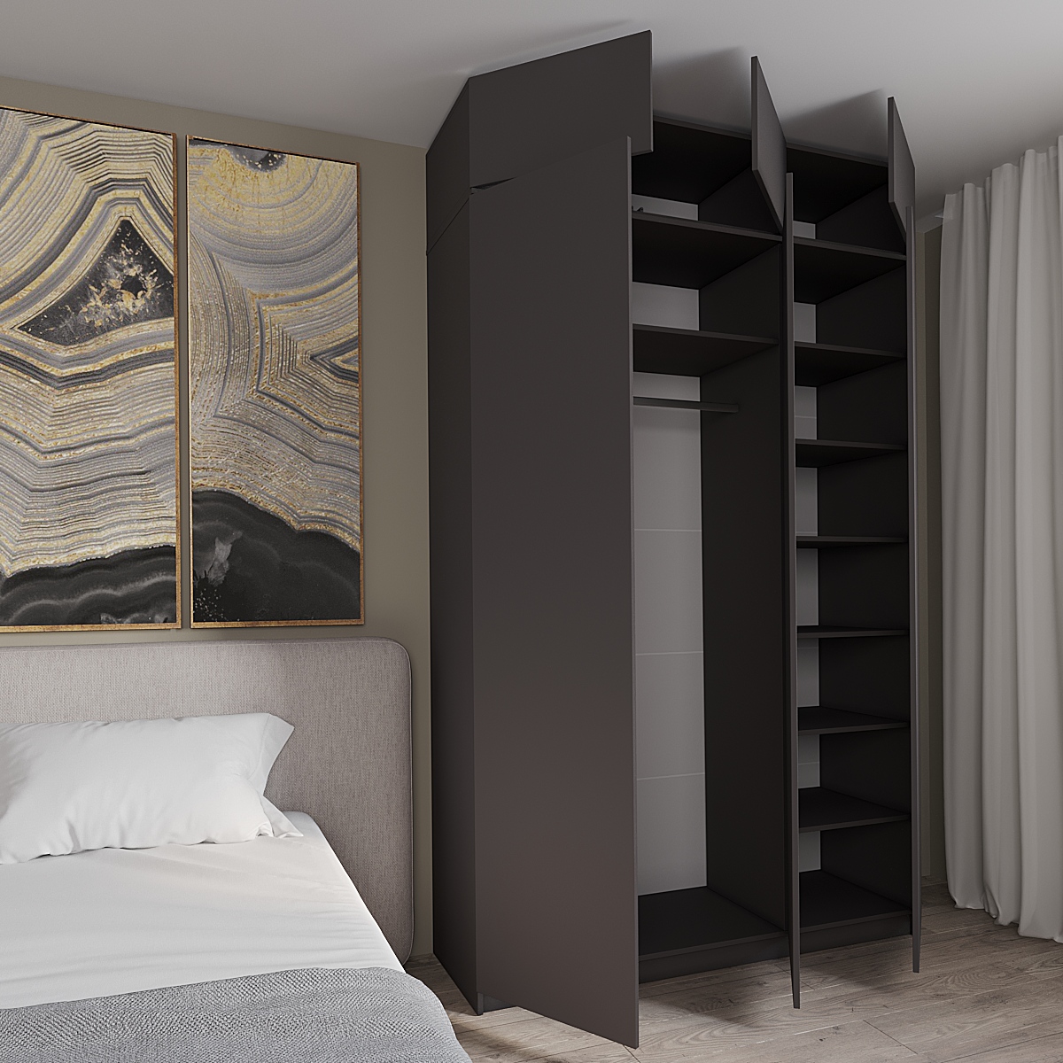 Внутри вы найдете вместительный комод с шариковыми направляющими полного выдвижения, полки и штангу для одежды.