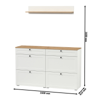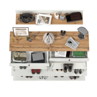 В комплектации 2 тумбы для обуви Остин 16.121. Каждая Тумба с выдвижным ящиком для мелочей сверху и 2 откидными дверками с полками для 12 пар обуви снизу. Всего - 24 пары обуви. Каждая откидная дверь расчитана для хранения и размещения 6 пар невысокой обуви. Максимальная нагрузка на каждую полку и ящик - 3 кг.