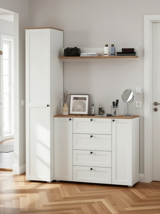 Шкаф-пенал с полками и вешалкой для верхней одежды с комодом и полкой Остин – современное решение для прихожей, сочетающее стиль, практичность и функциональность.