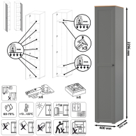 Шкаф-пенал имеет два варианта наполнения - 6 полок или штанга с антресольной и нижней полочками. Узкий пенал имеет распашную дверь и внутри расположено шесть полок. Максимальная нагрузка на каждую полку - 5 кг. Четыре центральные полочки являются съемными и при необходимости, Вы оперативно можете переоборудовать пенал, установив штангу для одежды на плечиках. Универсальная сборка двери - может быть установлена как на левую, так и на правую сторону.