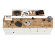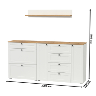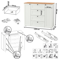Комод имеет 3 части - центральная - это 4 выдвижных ящика, по бокам закрытые распашными дверками ниши с 2 полками в каждой. В комоде предусмотрены съемные полки. Скрытые направляющие выдвижных ящиков с доводчиками предназначены для обеспечения мягкого и плавного закрывания. Двери оснащены четырехшарнирными петлями с доводчиками, что обеспечивает удобство и комфорт. Мебель оснащена регулируемыми опорами, выполненными из серого пластика. Регулировка обеспечивает возможность легкой коррекции высоты и позволяет достичь оптимального положения мебели, компенсируя неровности пола. Лицевая фурнитура в виде черных аккуратных ручек на фасадах придает интерьеру стильный и современный вид, добавляя при этом элегантности общему дизайну помещения.