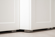 Комод имеет 3 части - центральная - это 4 выдвижных ящика, по бокам закрытые распашными дверками ниши с 2 полками в каждой. В комоде предусмотрены съемные полки. Скрытые направляющие выдвижных ящиков с доводчиками предназначены для обеспечения мягкого и плавного закрывания. Двери оснащены четырехшарнирными петлями с доводчиками, что обеспечивает удобство и комфорт. Мебель оснащена регулируемыми опорами, выполненными из серого пластика. Лицевая фурнитура в виде черных аккуратных ручек на фасадах придает интерьеру стильный и современный вид, добавляя при этом элегантности общему дизайну помещения.