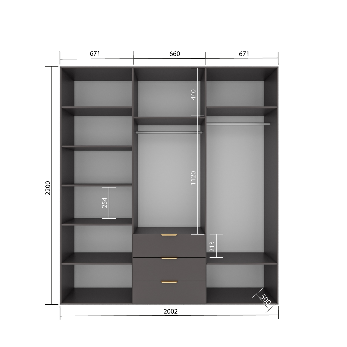 Глубина 50 см оптимальна для размещения плечиков с одеждой, а высота 220 см делает этот гардероб заметным элементом интерьера.