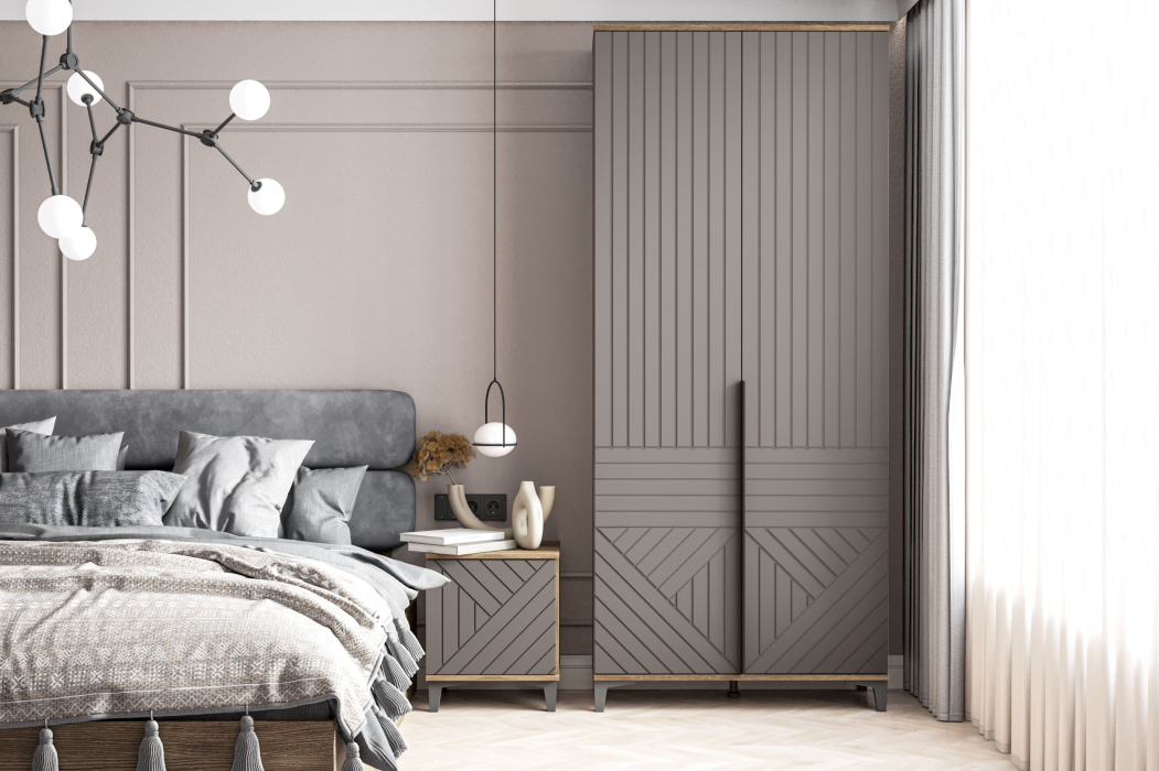 Сочетание корпуса цвета «табак» и фасада «серый софт» создает элегантный контраст, придавая шкафу современный вид.