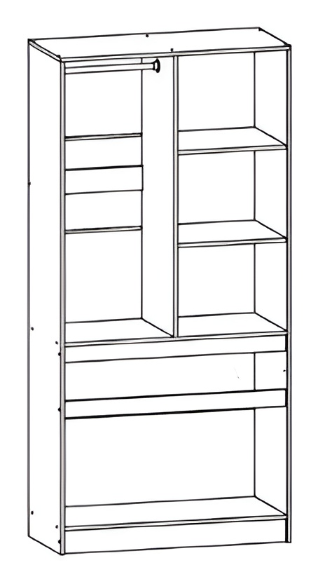 За распашными дверьми штанга и 2 полки, в нижней части шкафа располагается вместительный ящик.