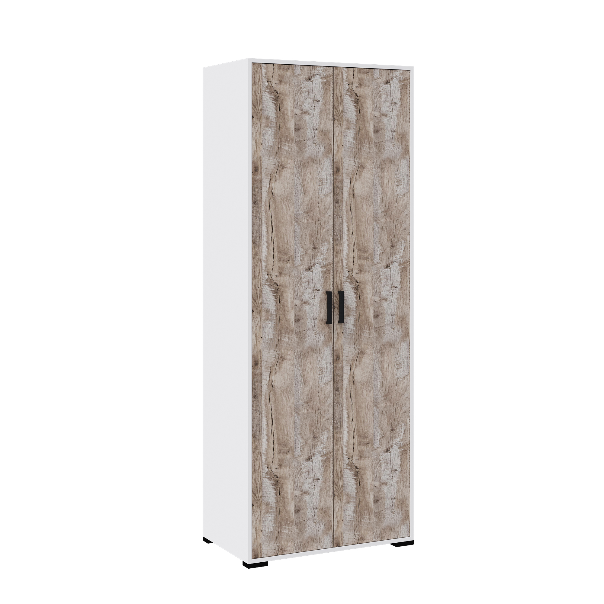 Шкаф выполнен в белом цвете с фасадами в натуральном оттенке дуб юкон, что придает ей элегантный и современный вид.