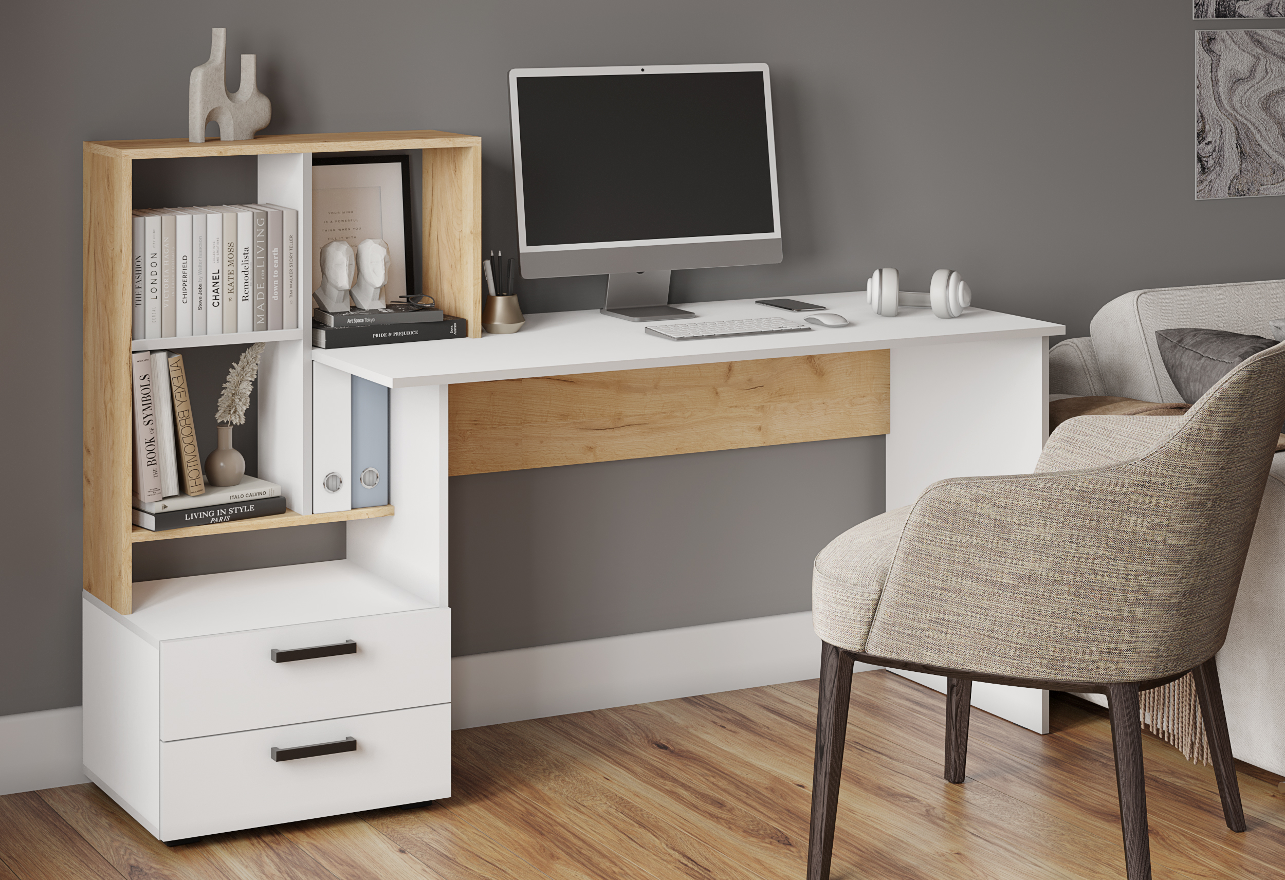 Данная модель стола сочетает рабочую зону и вместительную зону хранения.