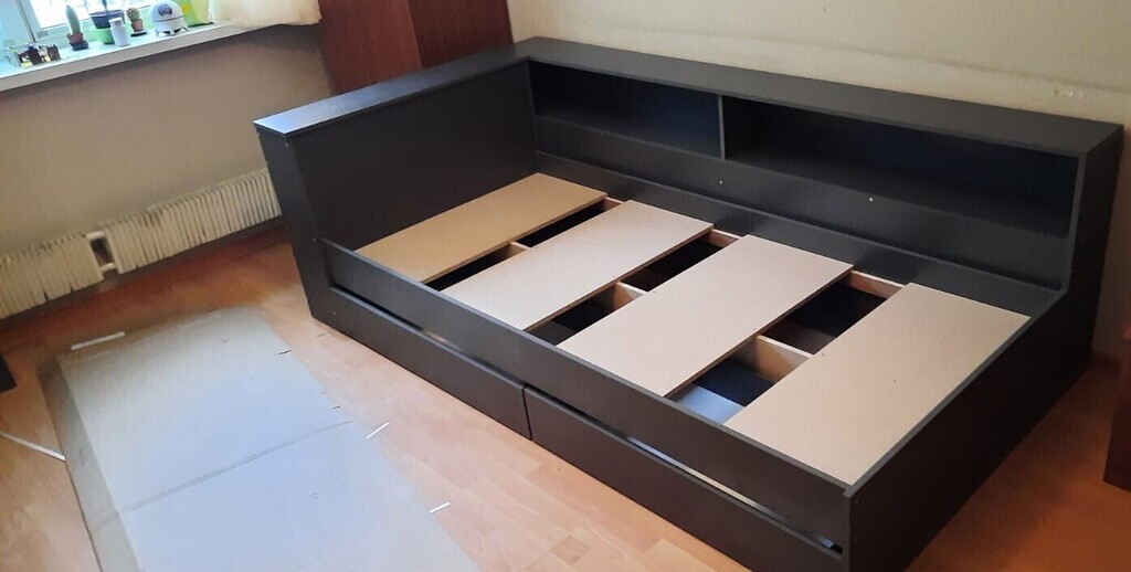 Ящики кровати сделаны на колесных опорах, что позволяет их перемещать по комнате, облегчая уборку помещения.
