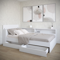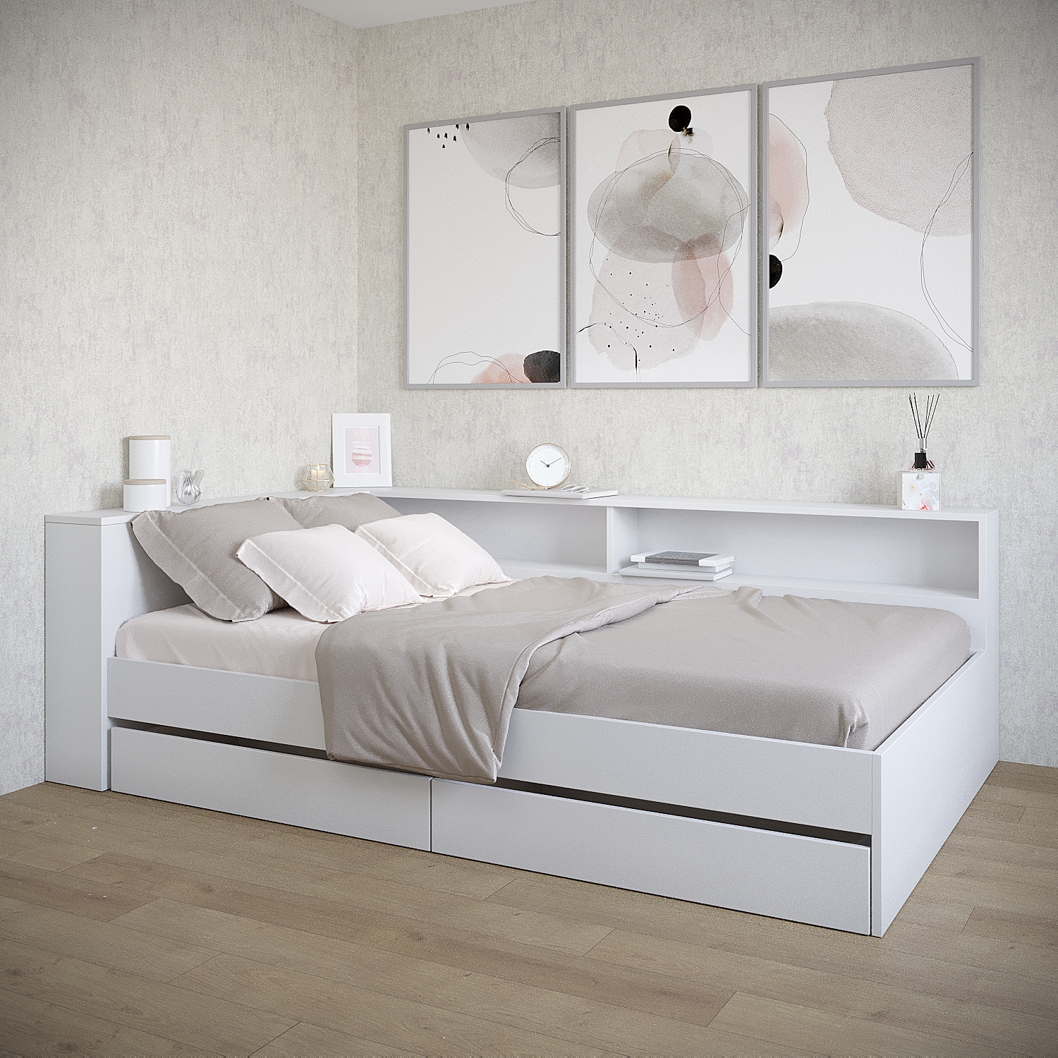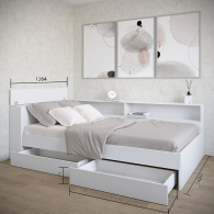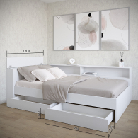 Кровать, имеет два ящика внизу и ящик в изголовье, так же в наборе идет прикроватный блок с полками.