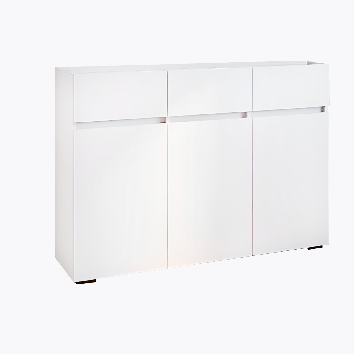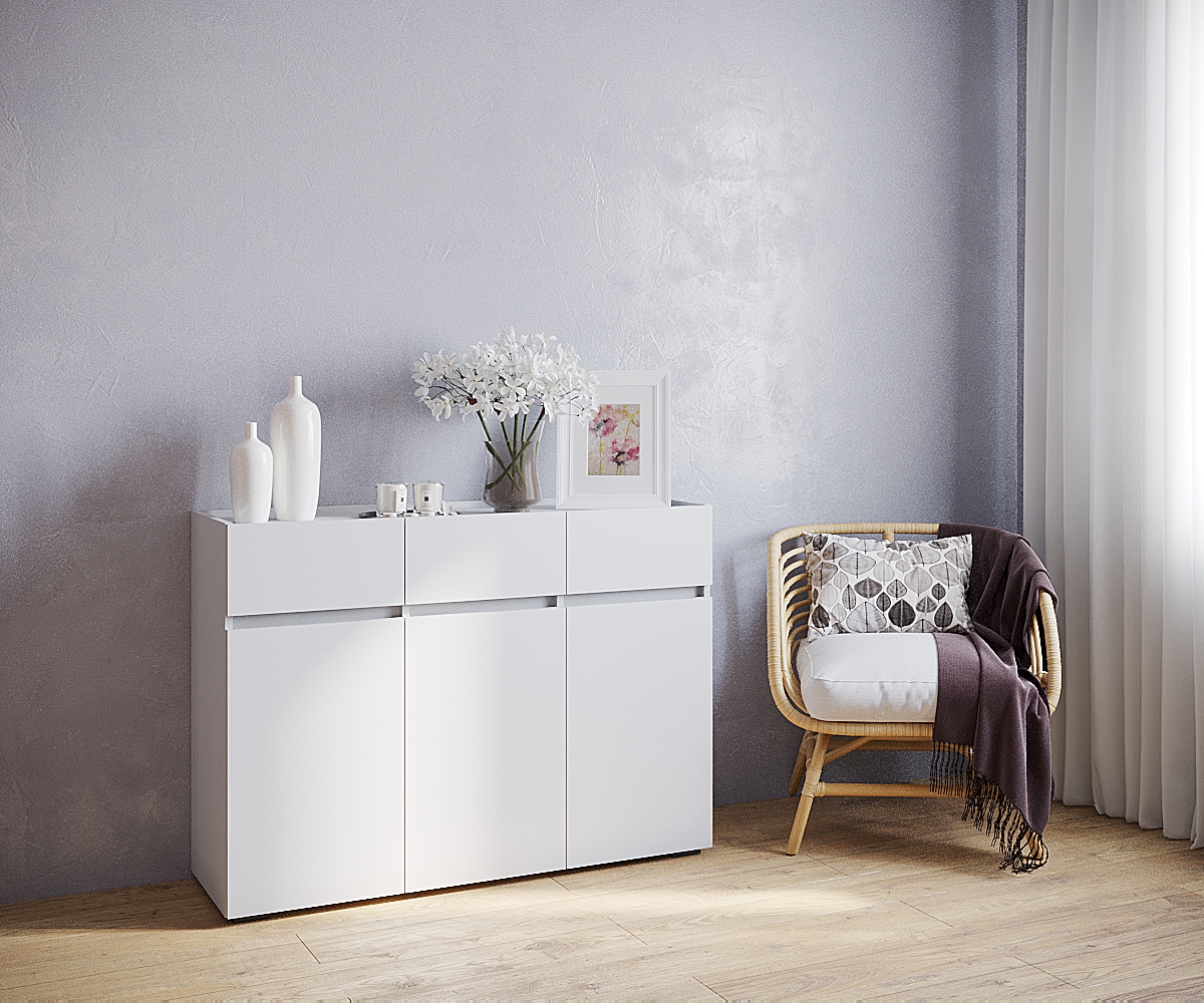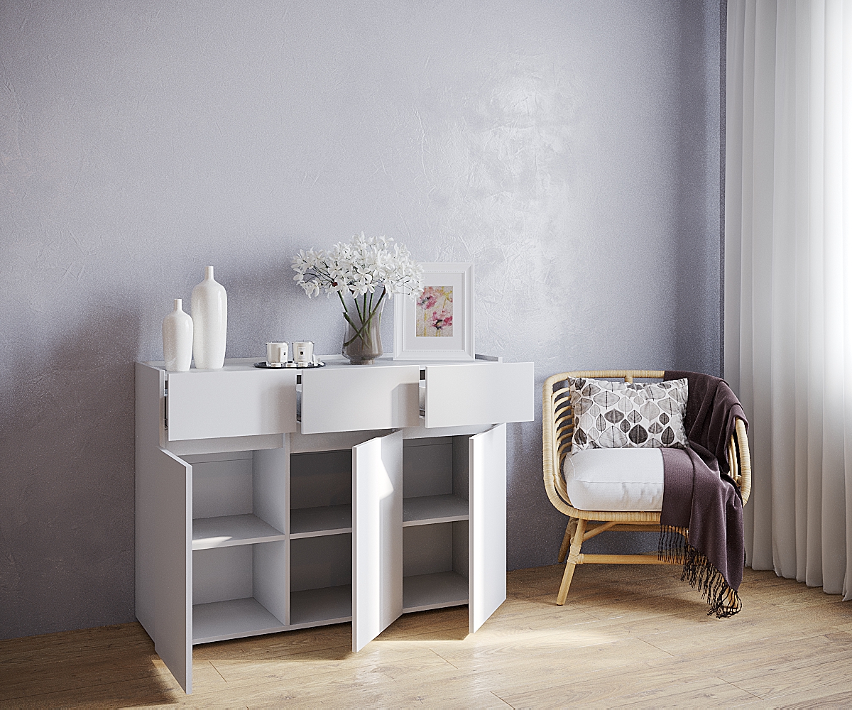 Ручки на фасадах отсутствуют, их функцию выполняет сам фасад, что придает комоду особую элегантность и современный вид.