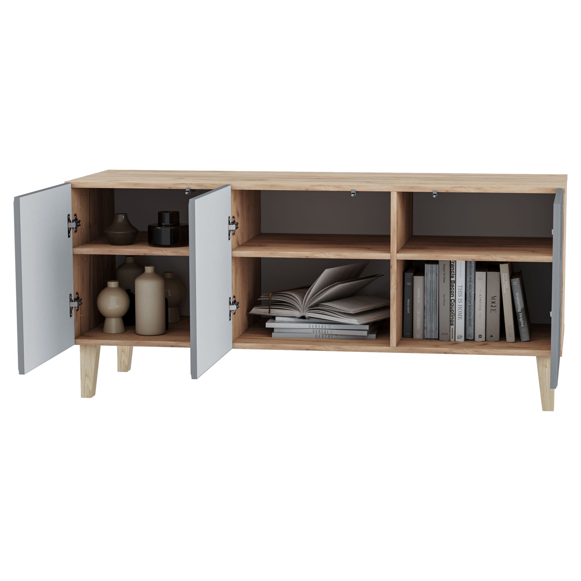 Комод включает в себя три просторных отделения с полками.