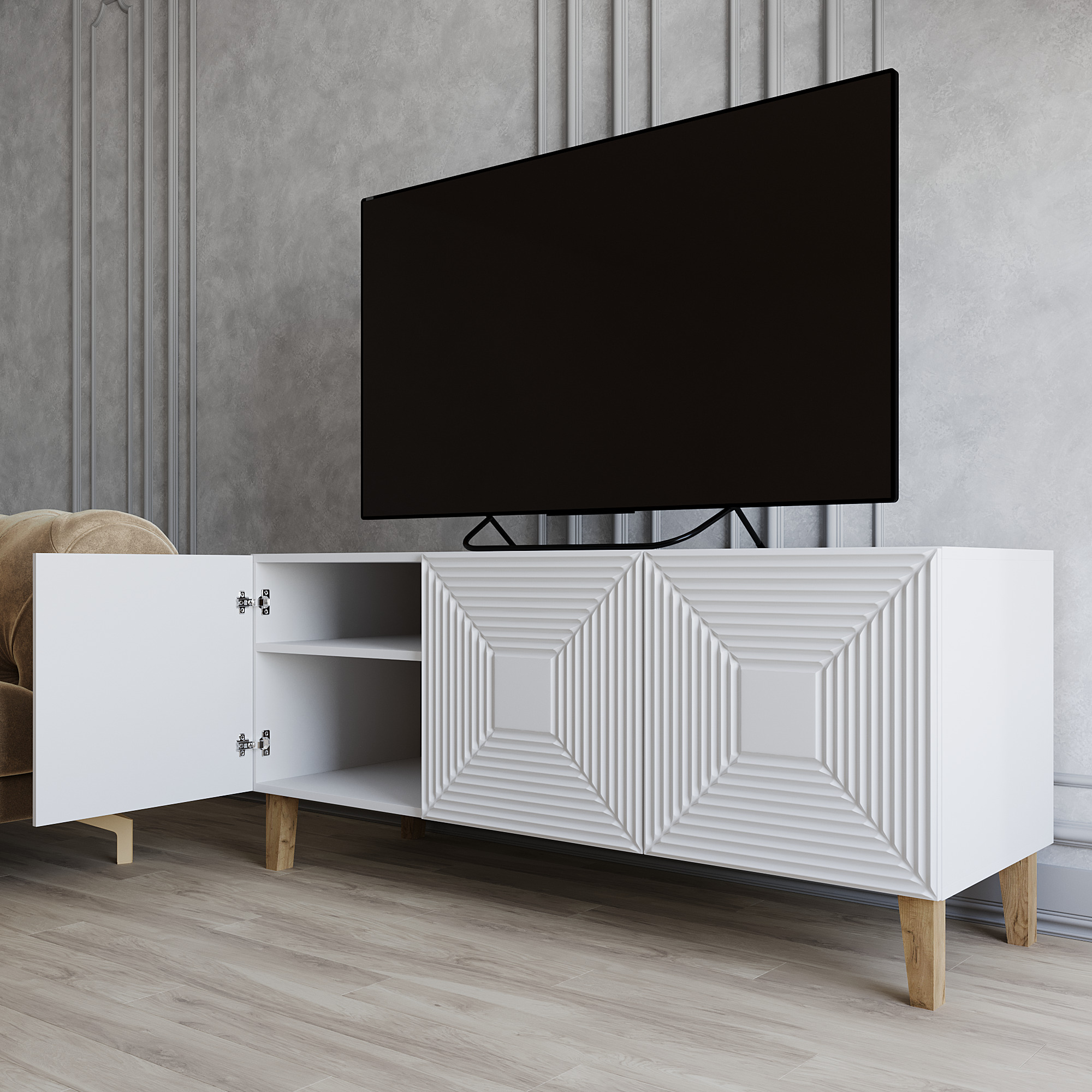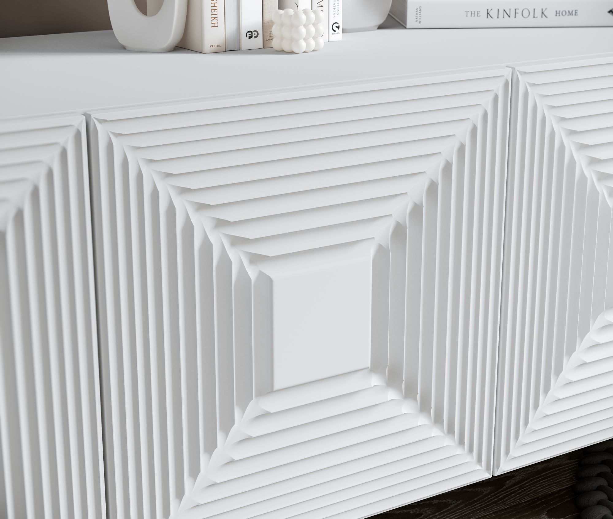 Отличительной особенностью тумбочки является то, что открытие фасадов осуществляется при помощи механизма push to open, что позволяет избежать использования ручек и придаёт тумбе минималистичный и аккуратный внешний вид.