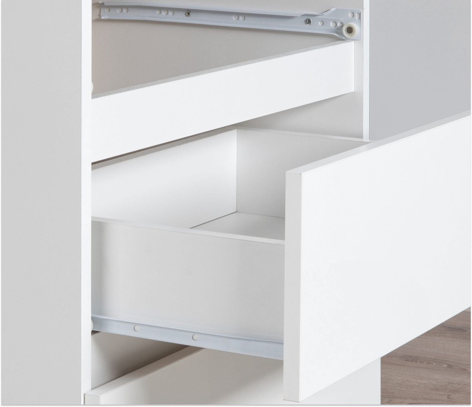 Стеллаж имеет открытые полки и 3 ящика на роликовых направляющих,соединение элементов мебельной конструкции с помощью эксцентриков.
