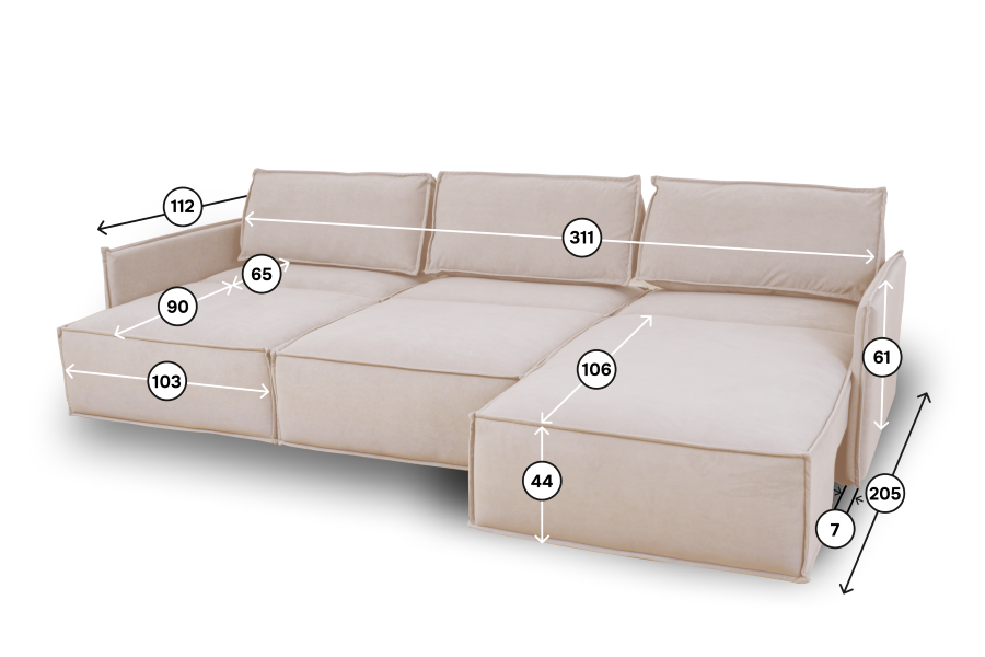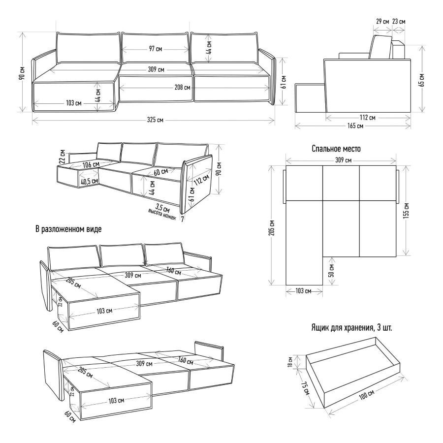Угловой модульный диван-кровать - образец стиля минимализм. Каркас дивана состоит из массива сосны и березовой фанеры. Обивка износостойкая с влагоотталкивающей пропиткой и защитой от когтей мелких животных. Механизм "Еврокнижка" трансформирует модель в двуспальную кровать и подходит для ежедневного сна. Основой матраса является блок независимых пружин, расположенный по всей поверхности спального места. Он поможет правильно поддерживать ваше тело во время сна. Преимуществом модели служит наличие трех вместительных ящиков для хранения, один у основных модулей и один у оттоманки. В ящиках установлена светодиодная подсветка.