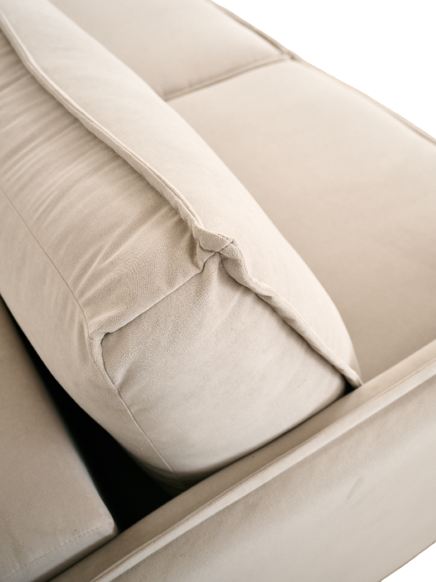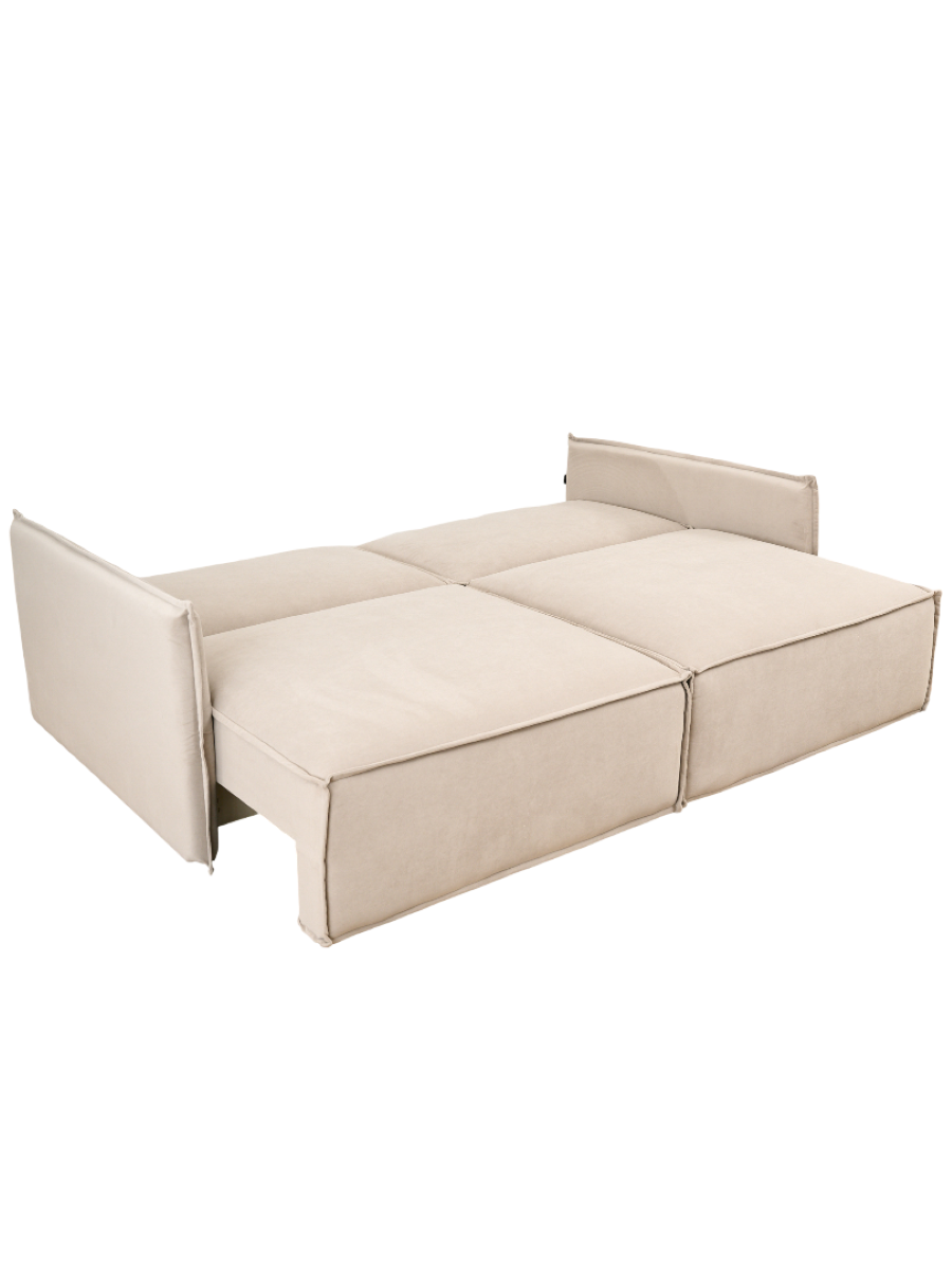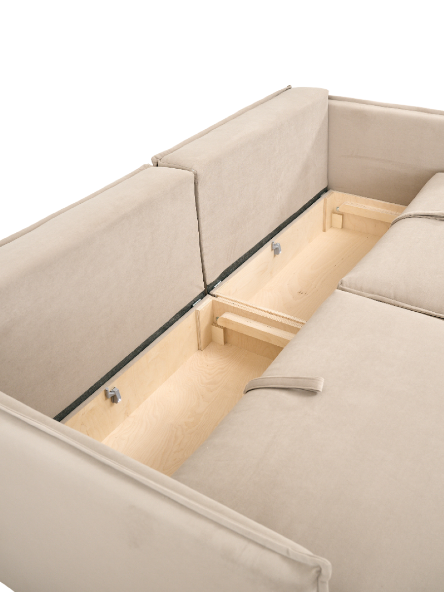 Угловой модульный диван-кровать -- образец стиля минимализм. Каркас дивана состоит из массива сосны и березовой фанеры. Обивка износостойкая с влагоотталкивающей пропиткой и защитой от когтей мелких животных. Механизм «Еврокнижка» трансформирует модель в двуспальную кровать и подходит для ежедневного сна. Основой матраса является блок независимых пружин, расположенный по всей поверхности спального места. Он поможет правильно поддерживать ваше тело во время сна. Преимуществом модели служит наличие двух вместительных ящиков для хранения, один у основного модуля и один у оттоманки. В ящиках установлена светодиодная подсветка.