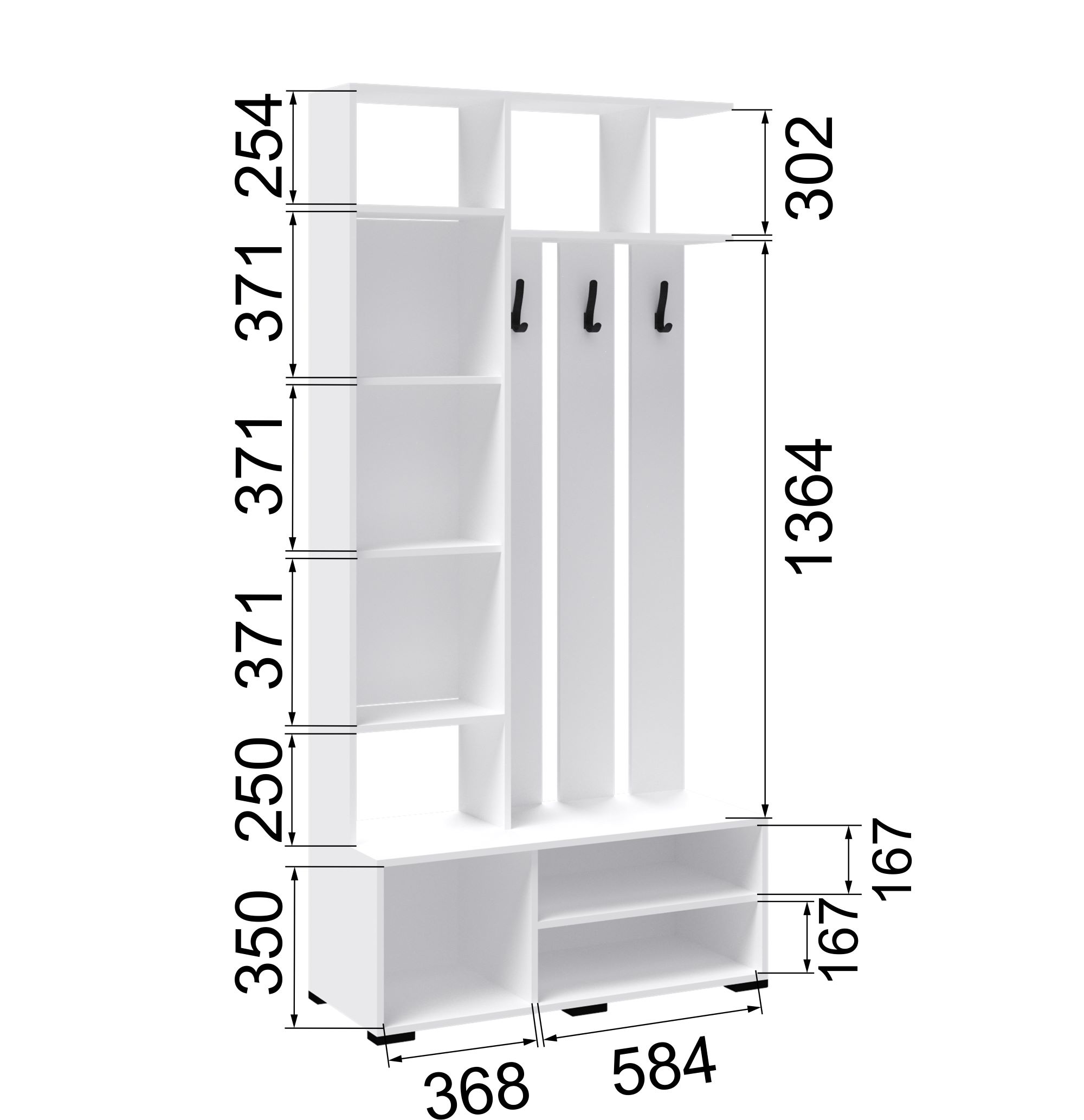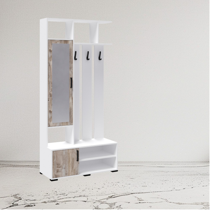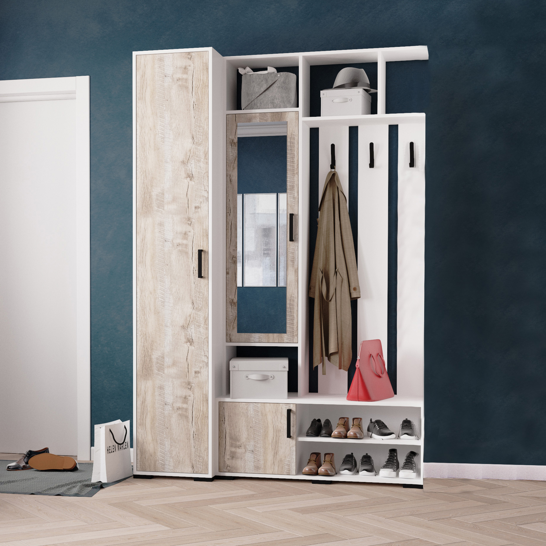 Функциональность - прихожая модульная, включает шкаф для одежды, полки для головных уборов и обуви, а также зеркало с тумбой.