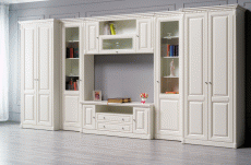 Мебель выполнена из МДФ с 3D-фрезеровкой, его отличают высокая прочность и долговечность, экологичность и безопасность. Две вариации шкафов – с глухим и стеклянным фасадом позволят как разместить книги, сувениры, так и скрыть то, что необходимо от посторонних глаз.