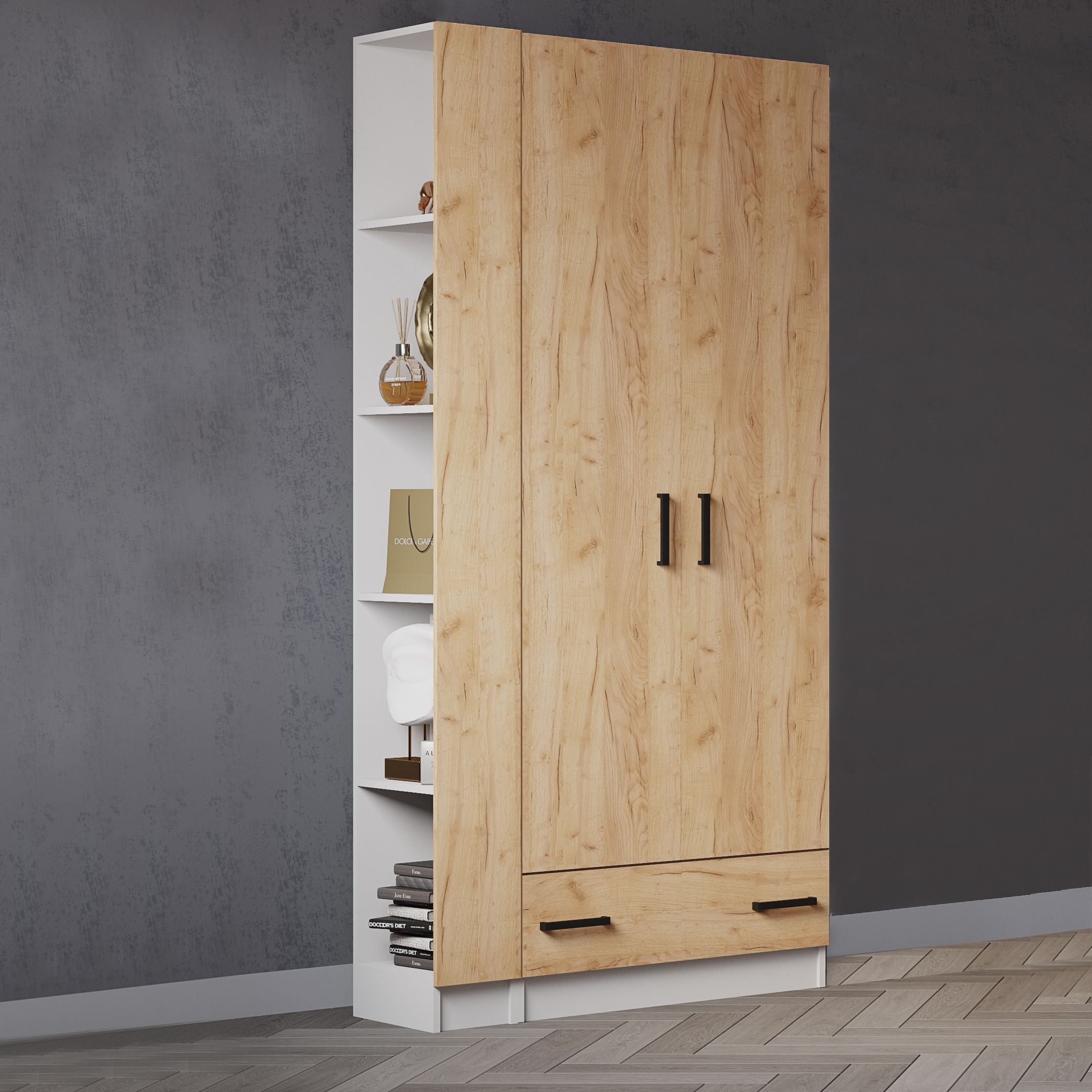 Отлично дополняют друг друга в Вашем доме. Сборка универсальная, стеллаж можно установить с любой стороны шкафа.