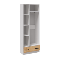 Стеллаж оснащен 4-мя вместительными полками. Шкаф из модульной прихожей "Кевин" имеет две створки и выдвижной ящик внизу для хранения мелочей.