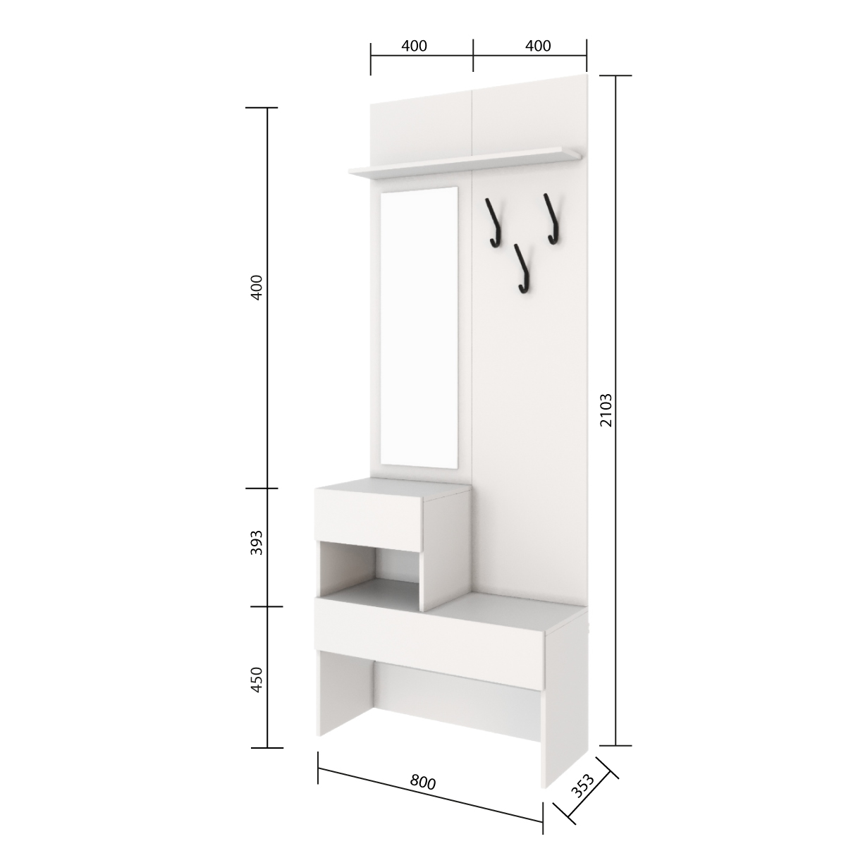 Секция с вешалкой, зеркалом и тумбой с выдвижным ящиком из модульной программы "Бостон" имеет компактные размеры 800*2103*353мм.