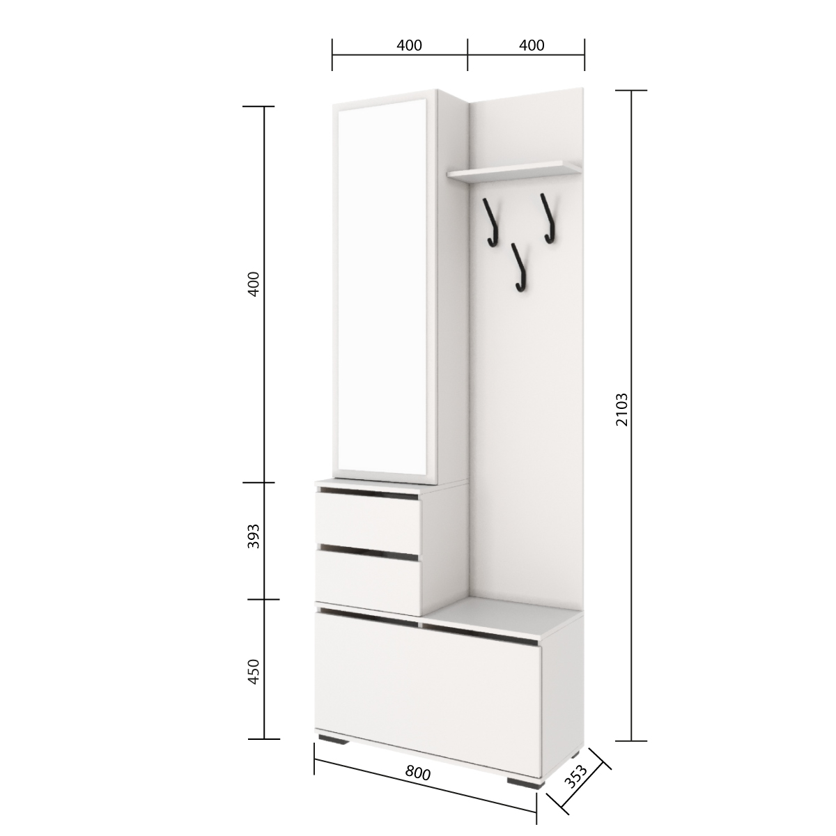 Секция с вешалкой, зеркалом и тумбой с 2-мя выдвижными ящиками из модульной программы "Бостон" имеет компактные размеры 800*2103*353мм.
