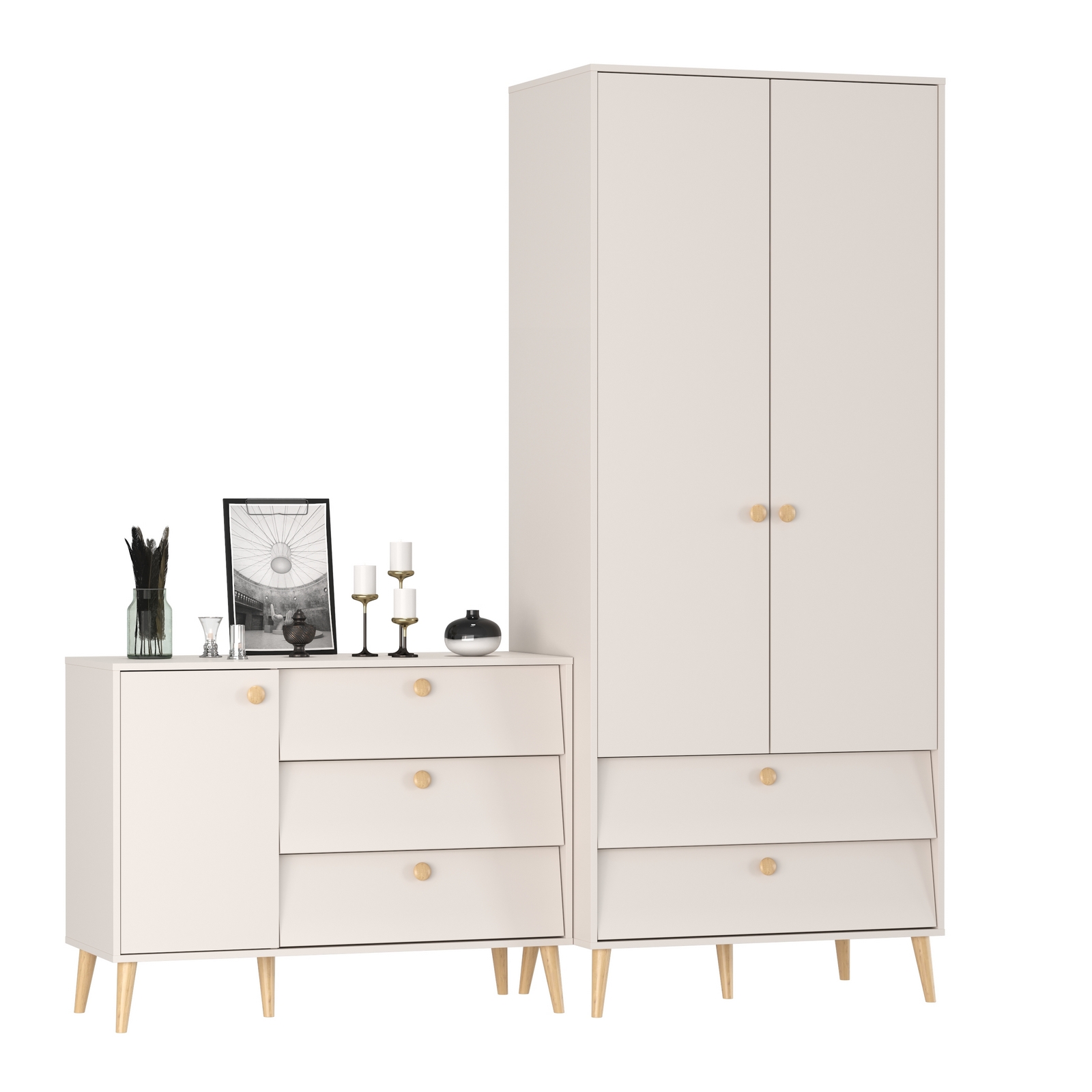 Афина спальня шкаф 2-х дверный и комод с дверкой и тремя ящиками – идеальный комплект для организации пространства спальни. Теплый цвет кашемир серый добавляет интерьеру уют и гармонию, прекрасно дополняя современный декор спальни.