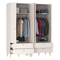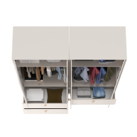 Каждый шкаф оснащен распашными дверями, за которыми расположены антресольная полка и штанга для удобного размещения одежды, обеспечивая порядок и легкий доступ к вещам.