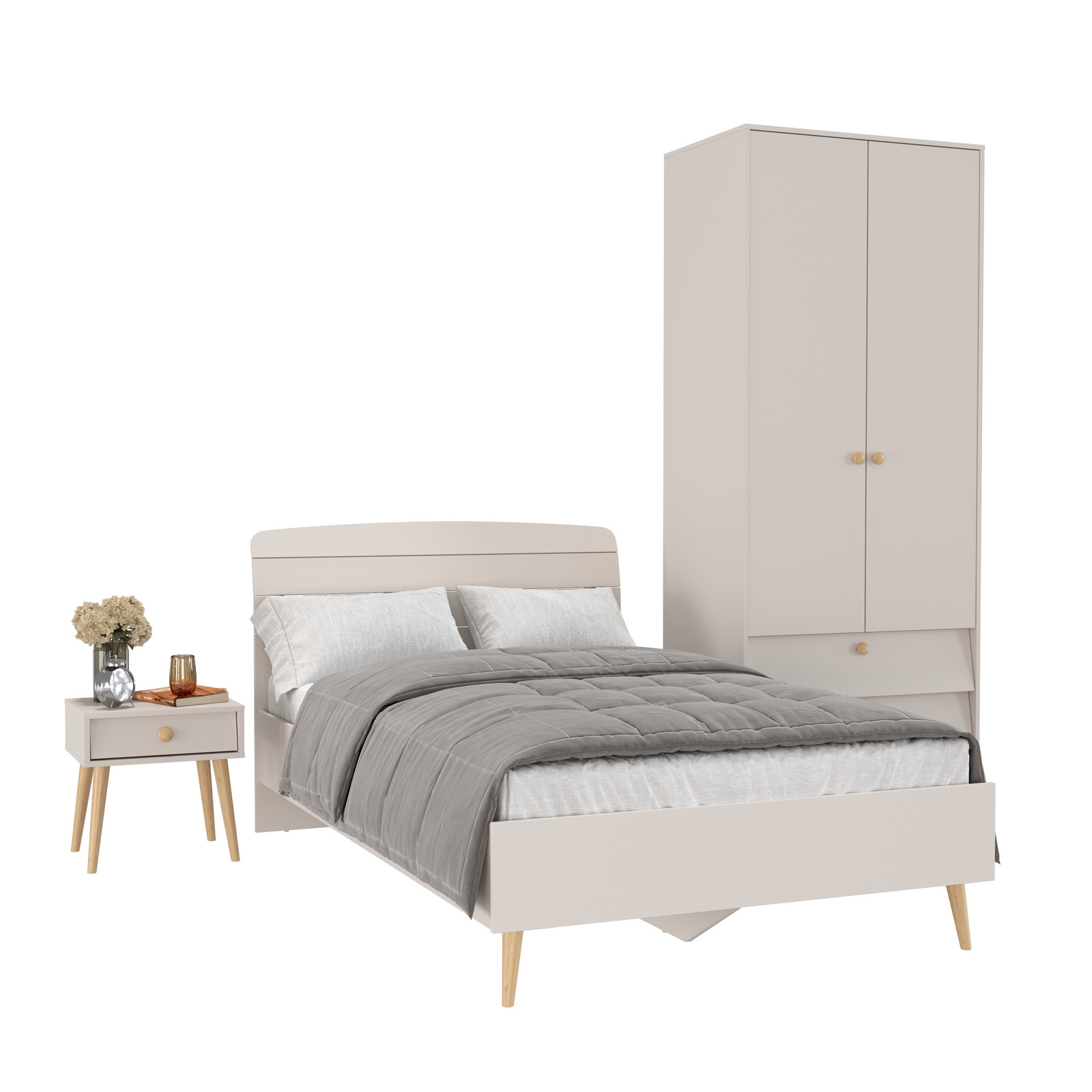 Шкаф 2-х дверный с кроватью Афина 1200 и прикроватной тумбочкой – функциональный и элегантный комплект мебели для спальни. Теплый цвет кашемир серый добавляет интерьеру уют и гармонию, прекрасно дополняя современный декор спальни.