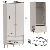 Двухдверный шкаф для одежды Афина 4-75901, за распашными дверями которого антресольная полка и штанга для одежды. Под отделением с дверями 2 ящика. Шкаф установлен на опоры высотой 16 см,