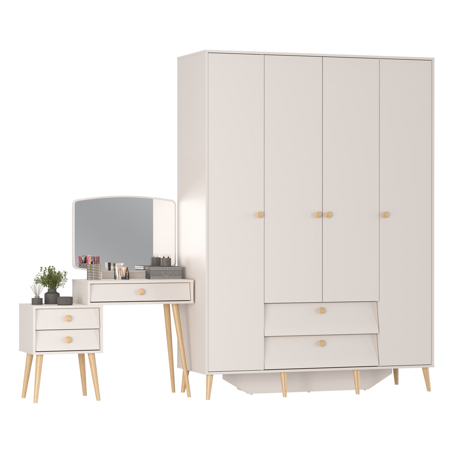 Трюмо с зеркалом и ящиками и комод-шкаф 4-х дверный Афина – изящное воплощение минимализма и утонченного стиля! Теплый цвет кашемир серый добавляет интерьеру уют и гармонию, прекрасно дополняя современный декор спальни.
