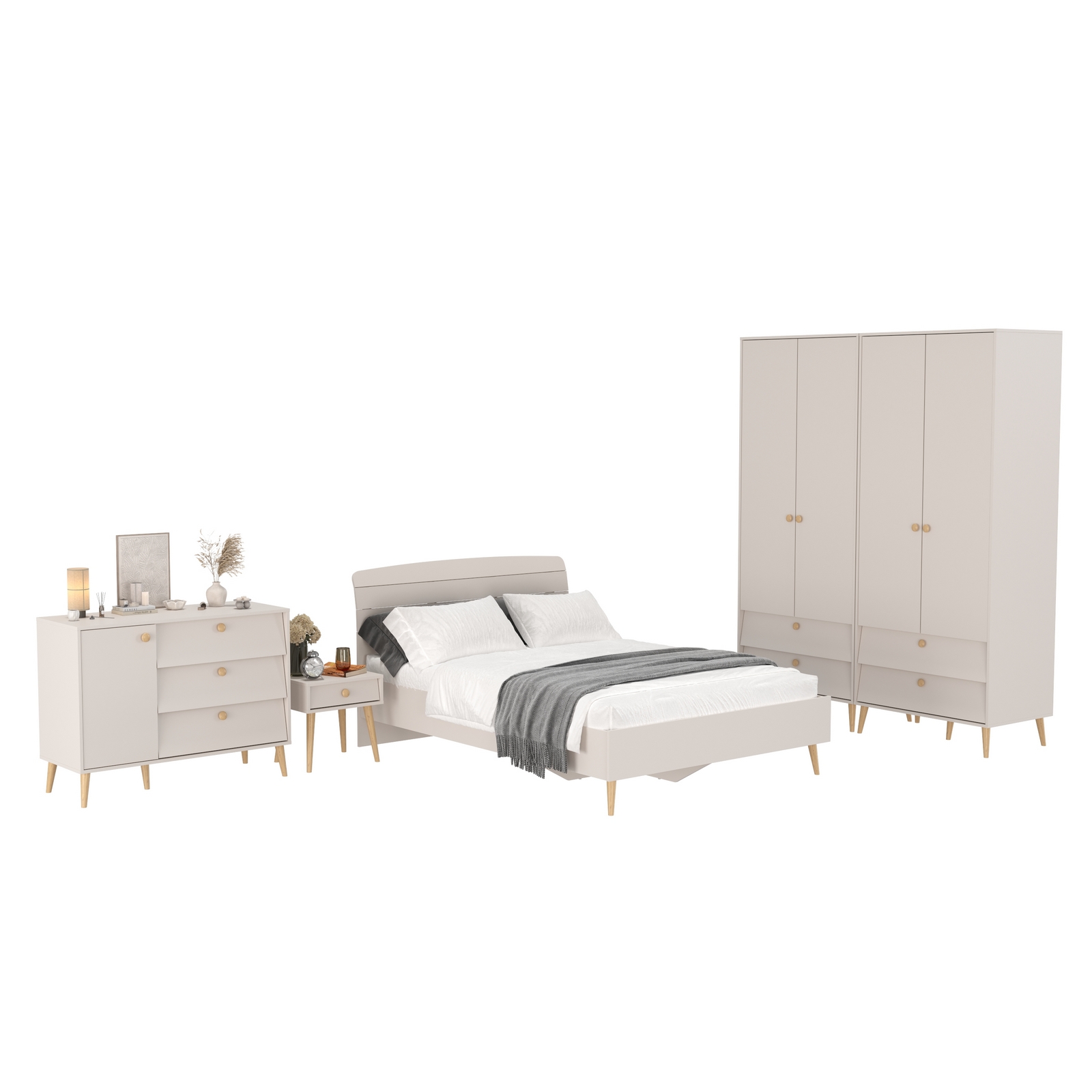Шкафы двухдверные с кроватью двуспальной 1400 Афина с тумбочкой на ножках и комодом – изящное воплощение минимализма и утонченного стиля! Теплый цвет кашемир серый добавляет интерьеру уют и гармонию, прекрасно дополняя современный декор спальни.