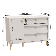 Комод Афина 4-44901 оснащен дверкой и 3 выдвижными ящиками - достаточно места для хранения одежды и аксессуаров. Комод установлен на опоры высотой 16 см. Универсальная сборка позволяет расположить дверку и ящики в любом удобном порядке.