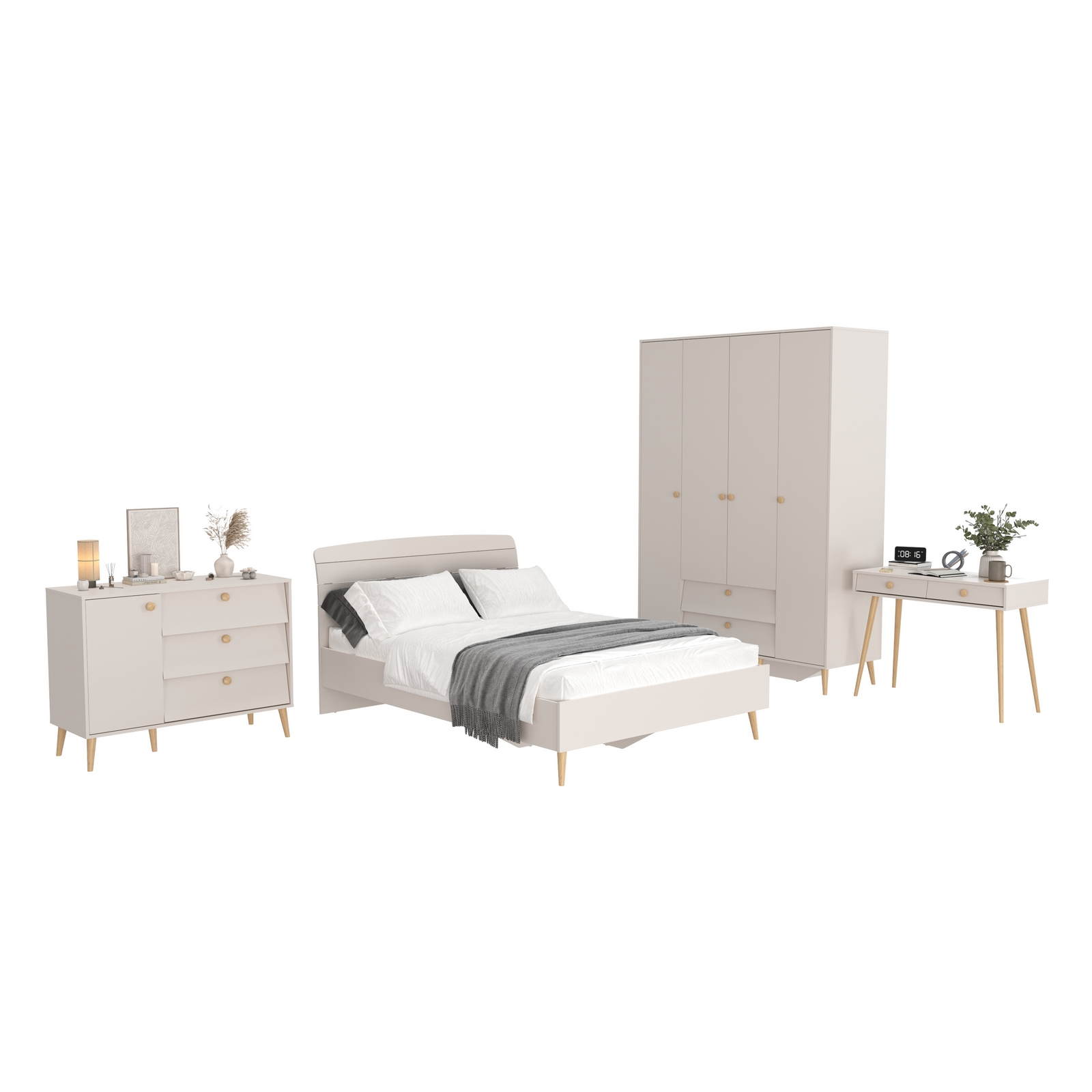 Столик на ножках с кроватью Афина 1400 со шкафом 4-ре двери и комодом с ящиками – удобная и элегантная мебель для спальни. Теплый цвет кашемир серый добавляет интерьеру уют и гармонию, прекрасно дополняя современный декор спальни.