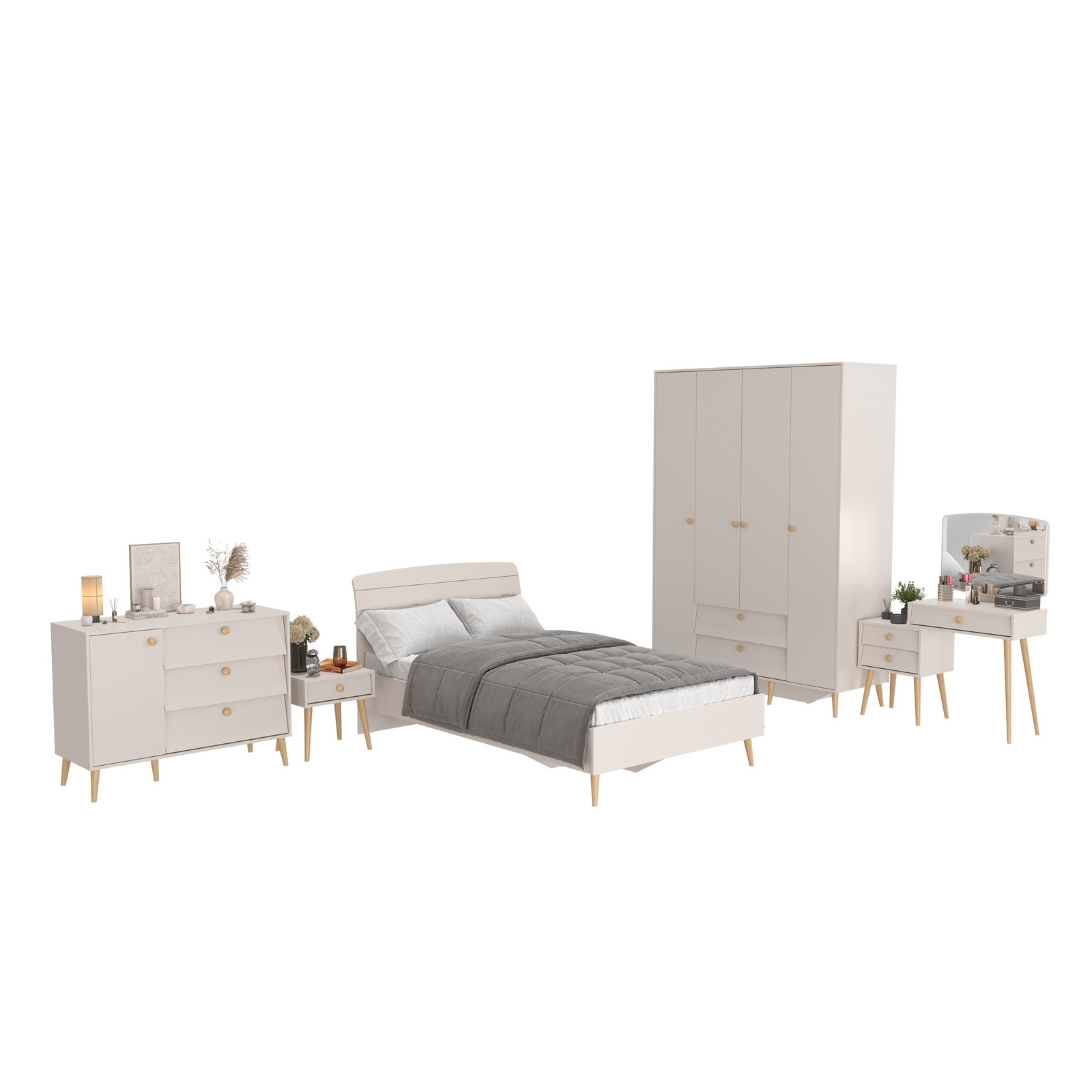 Комплектация включает кровать 1200 Афина 4-22905, тумбу прикроватную Афина 4-09901, трюмо с зеркалом Афина 4-25901, комод с дверкой и тремя ящиками Афина 4-44901 и шкаф 4-х дверный Афина 4-75930.