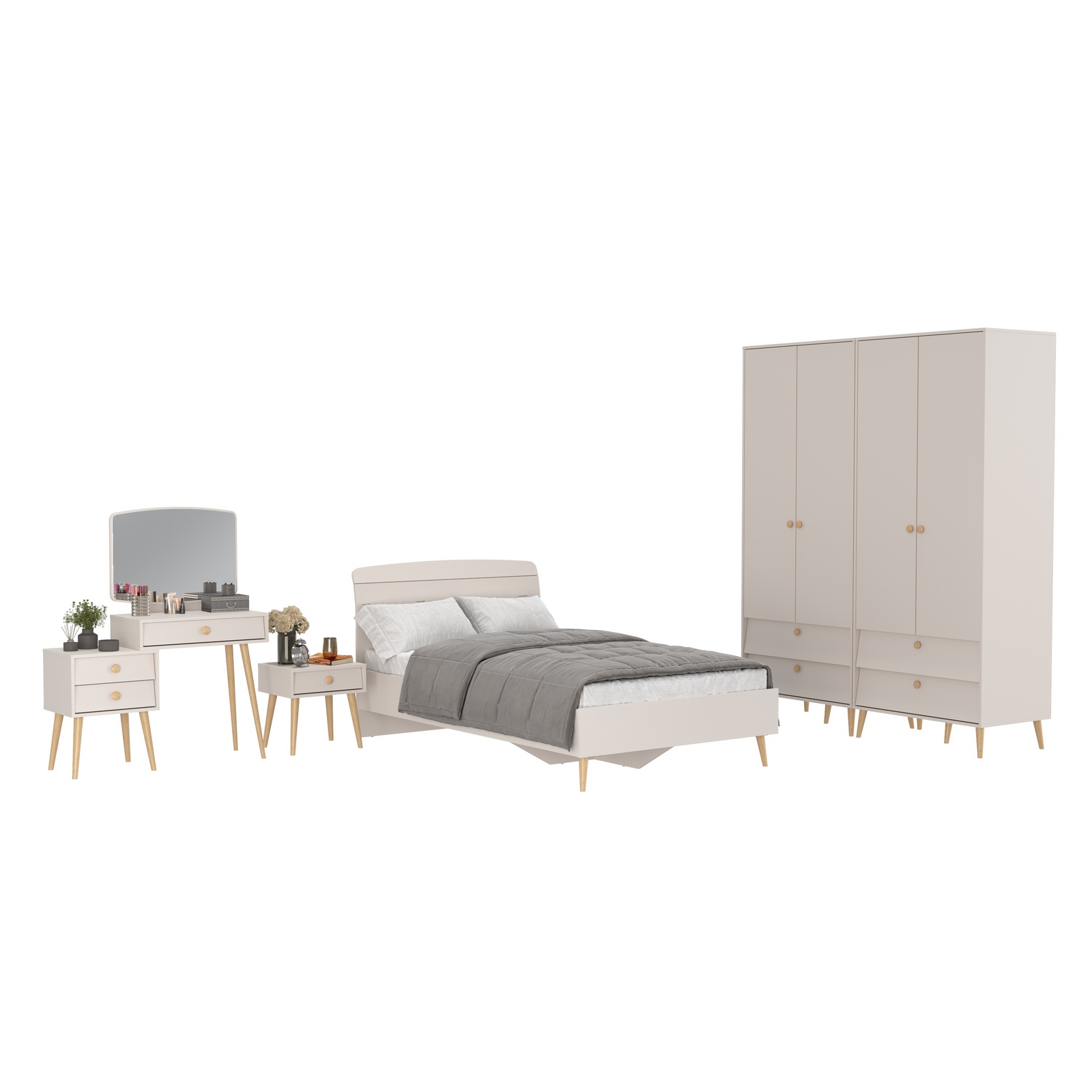 Туалетный столик с зеркалом Афина с кроватью 1200 с тумбочкой и двумя шкафами – изящное и функциональное решение для спальни. Теплый цвет кашемир серый добавляет интерьеру уют и гармонию, прекрасно дополняя современный декор спальни.