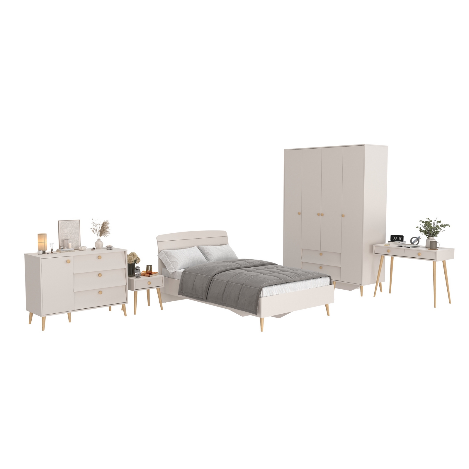 Комплектация включает кровать 1200 Афина 4-22905, тумбу прикроватную Афина 4-09901, туалетный столик Афина 4-25904, комод с дверкой и тремя ящиками Афина 4-44901 и шкаф 4-х дверный Афина 4-75930.