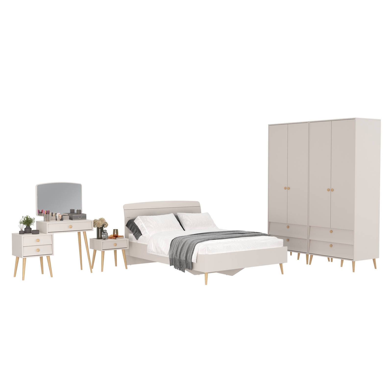 Туалетный столик с зеркалом Афина с кроватью 1400 с тумбочкой и двумя шкафами – изящное воплощение минимализма и утонченного стиля! Теплый цвет кашемир серый добавляет интерьеру уют и гармонию, прекрасно дополняя современный декор спальни.