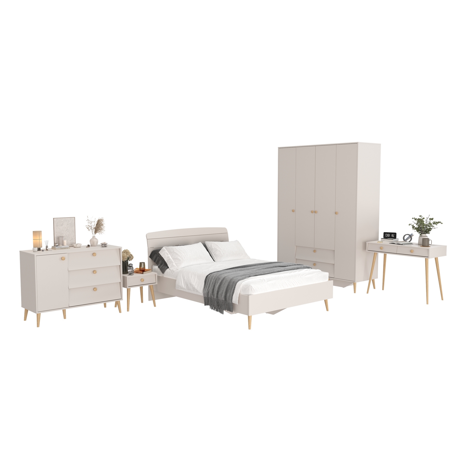 Набор мебели из пяти предметов в спальню Афина с кроватью на 1400 – изящное воплощение минимализма и утонченного стиля! Теплый цвет кашемир серый добавляет интерьеру уют и гармонию, прекрасно дополняя современный декор спальни.