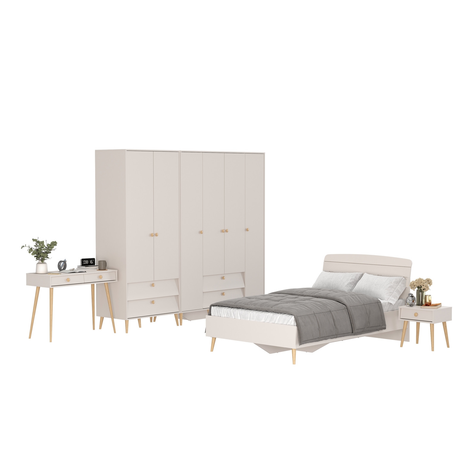Комплектация включает кровать 1200 Афина 4-22905, тумбу прикроватную Афина 4-09901, туалетный столик Афина 4-25904, шкаф 2-х дверный Афина 4-75901 и шкаф 4-х дверный Афина 4-75930.