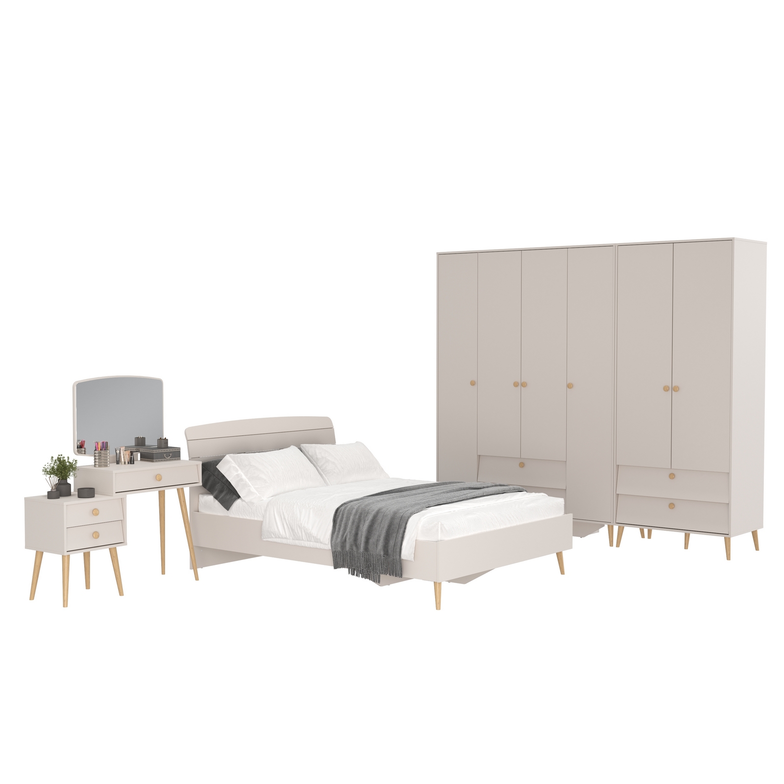 Афина мебель в спальню с кроватью 1400 – изящное воплощение минимализма и утонченного стиля! Теплый цвет кашемир серый добавляет интерьеру уют и гармонию, прекрасно дополняя современный декор спальни.