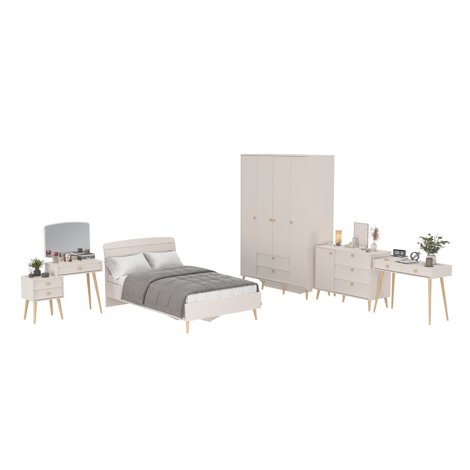 Комплектация включает кровать 1200 Афина 4-22905, туалетный столик Афина 4-25904, трюмо с зеркалом Афина 4-25901, комод с дверкой и тремя ящиками Афина 4-44901 и шкаф 4-х дверный Афина 4-75930.