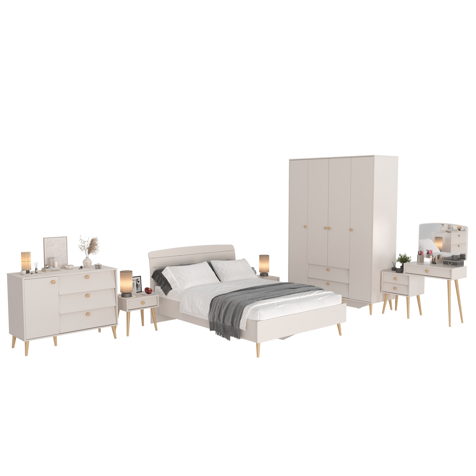 Комплектация включает кровать 1400 Афина 4-22911, две тумбы прикроватные Афина 4-09901, трюмо с зеркалом Афина 4-25901, комод с дверкой и тремя ящиками Афина 4-44901 и шкаф 4-х дверный Афина 4-75930.