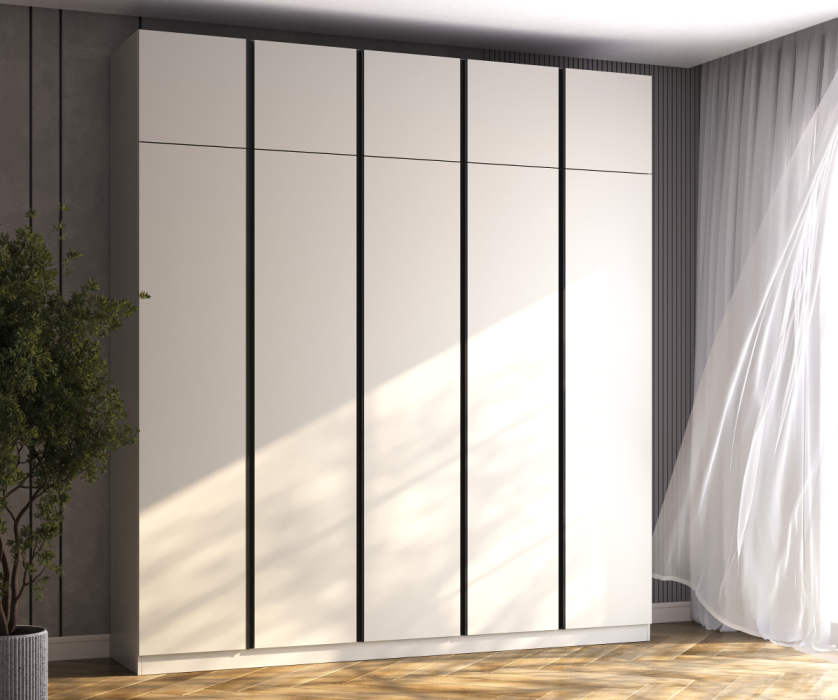 В спальне Букле предусмотрена фурнитура, которая обеспечивает комфортное использование. Глухие двери оснащены надежными петлями с доводчиками Boyard, что позволяет закрывать их плавно и бесшумно. Для дверей со стеклом используются беспружинные петли под систему Push-to-Open с врезными толкателями, что делает процесс открытия легким и удобным – достаточно легкого нажатия, чтобы получить доступ к содержимому.