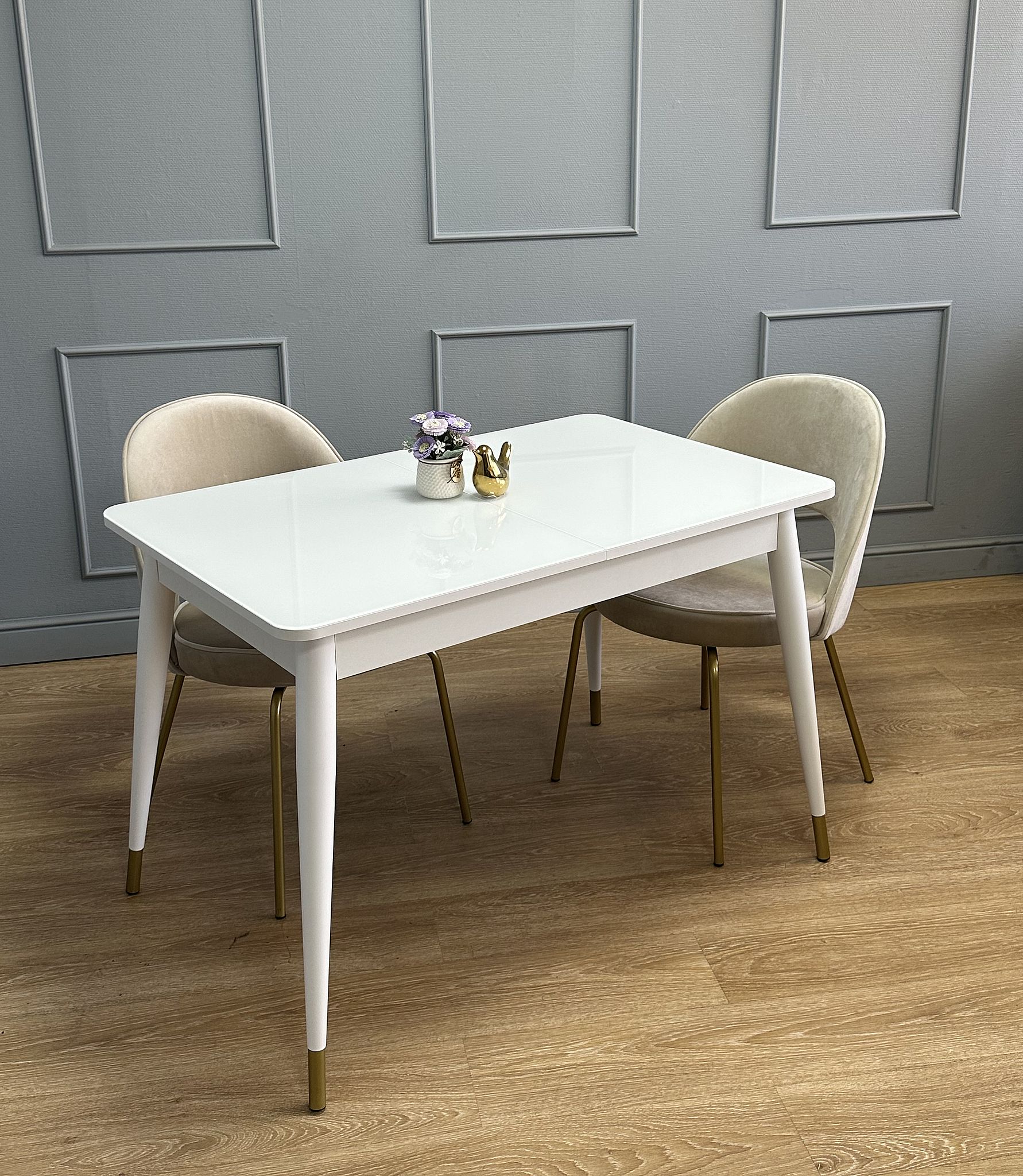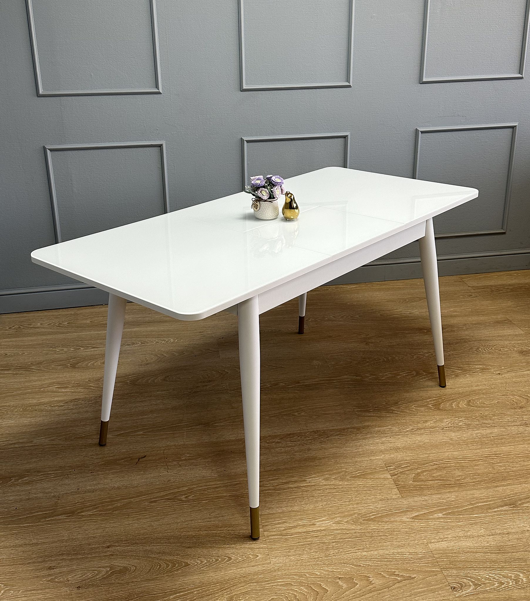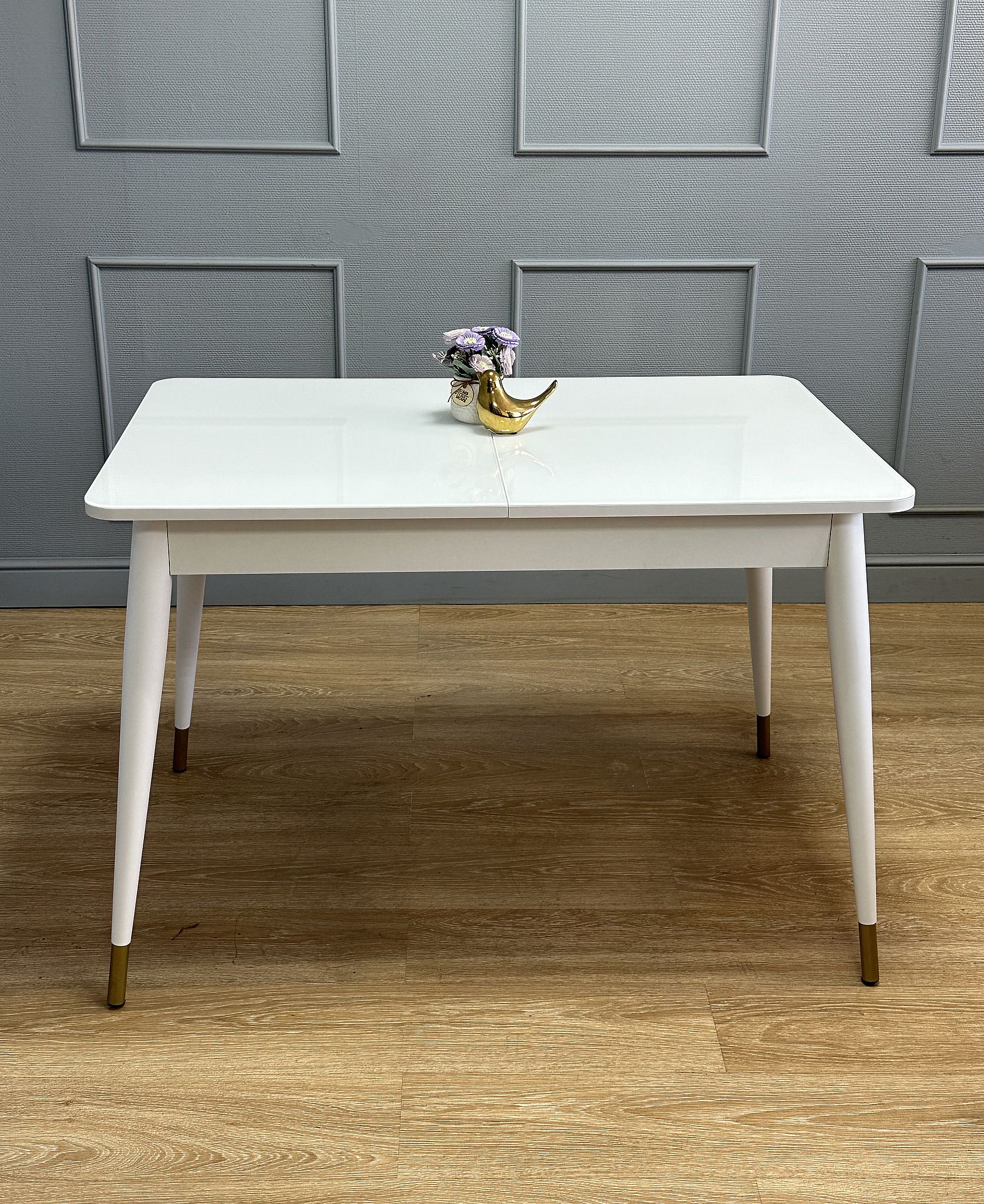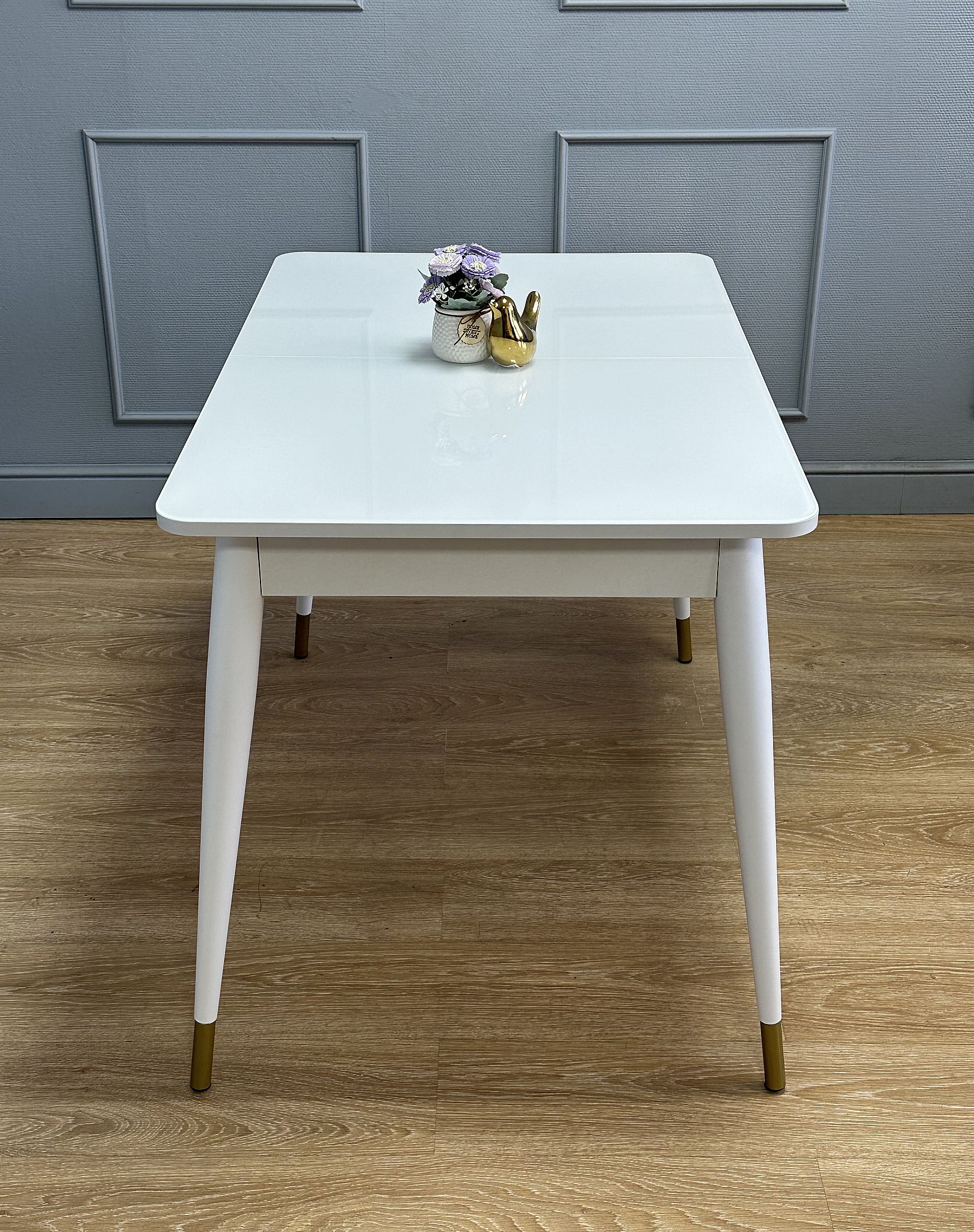 Стол со стеклом прекрасно выглядит и всегда идеально сочетается с белыми элементами, которые есть на каждой кухне. Он надежен, устойчив, с теплыми деревянными опорами.