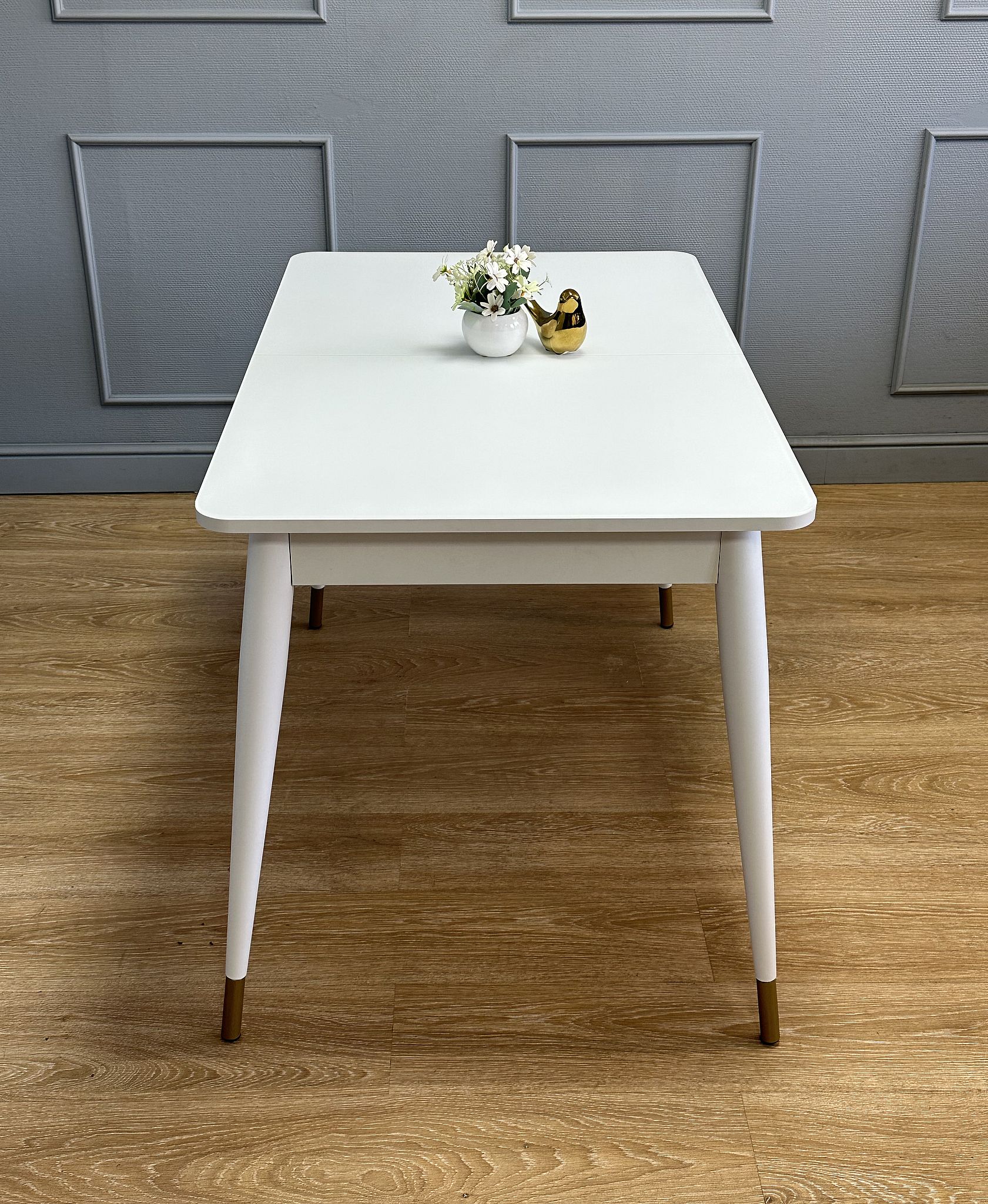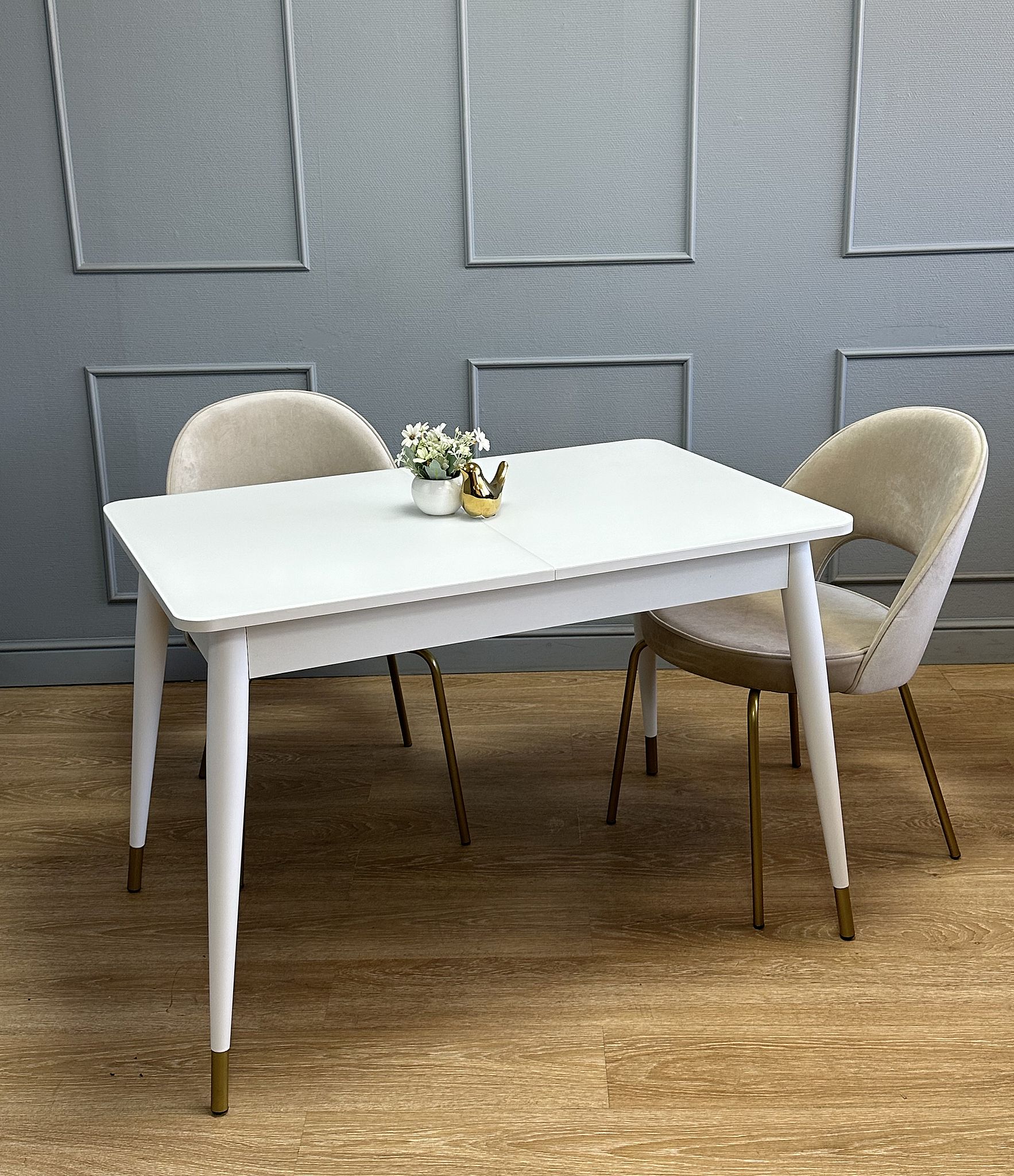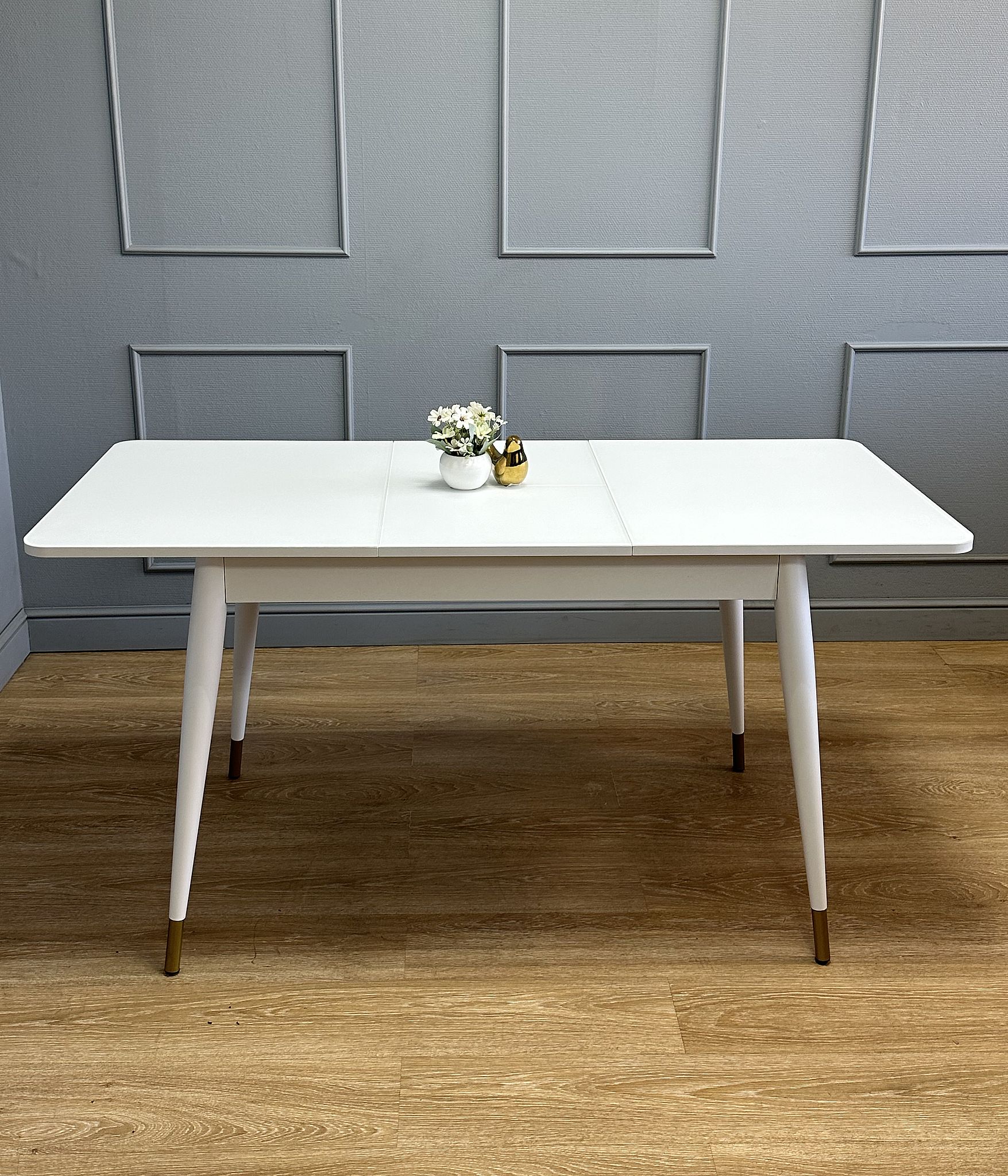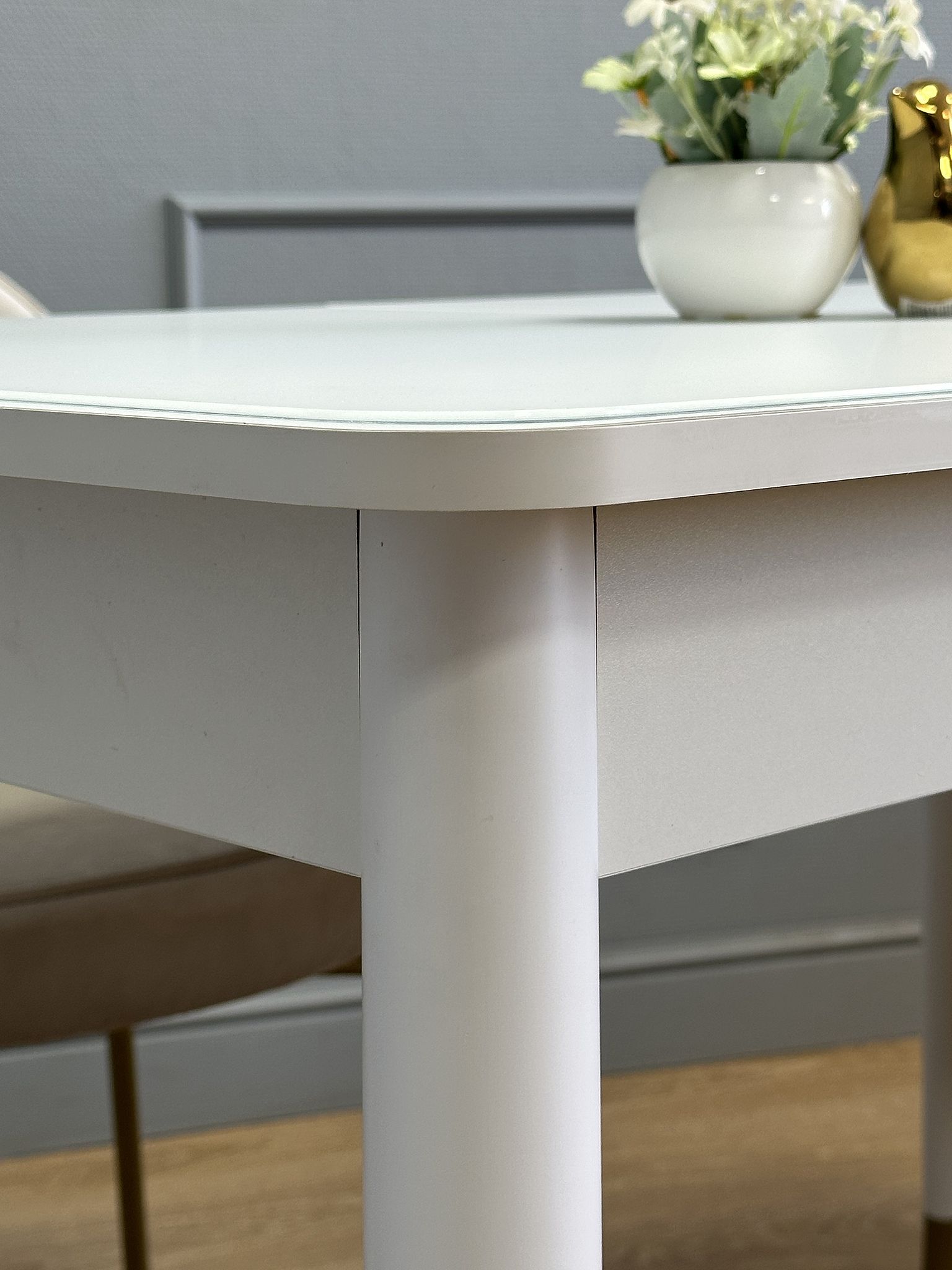 Стол со стеклом прекрасно выглядит и всегда идеально сочетается с белыми элементами, которые есть на каждой кухне. Он надежен, устойчив, с теплыми деревянными опорами.