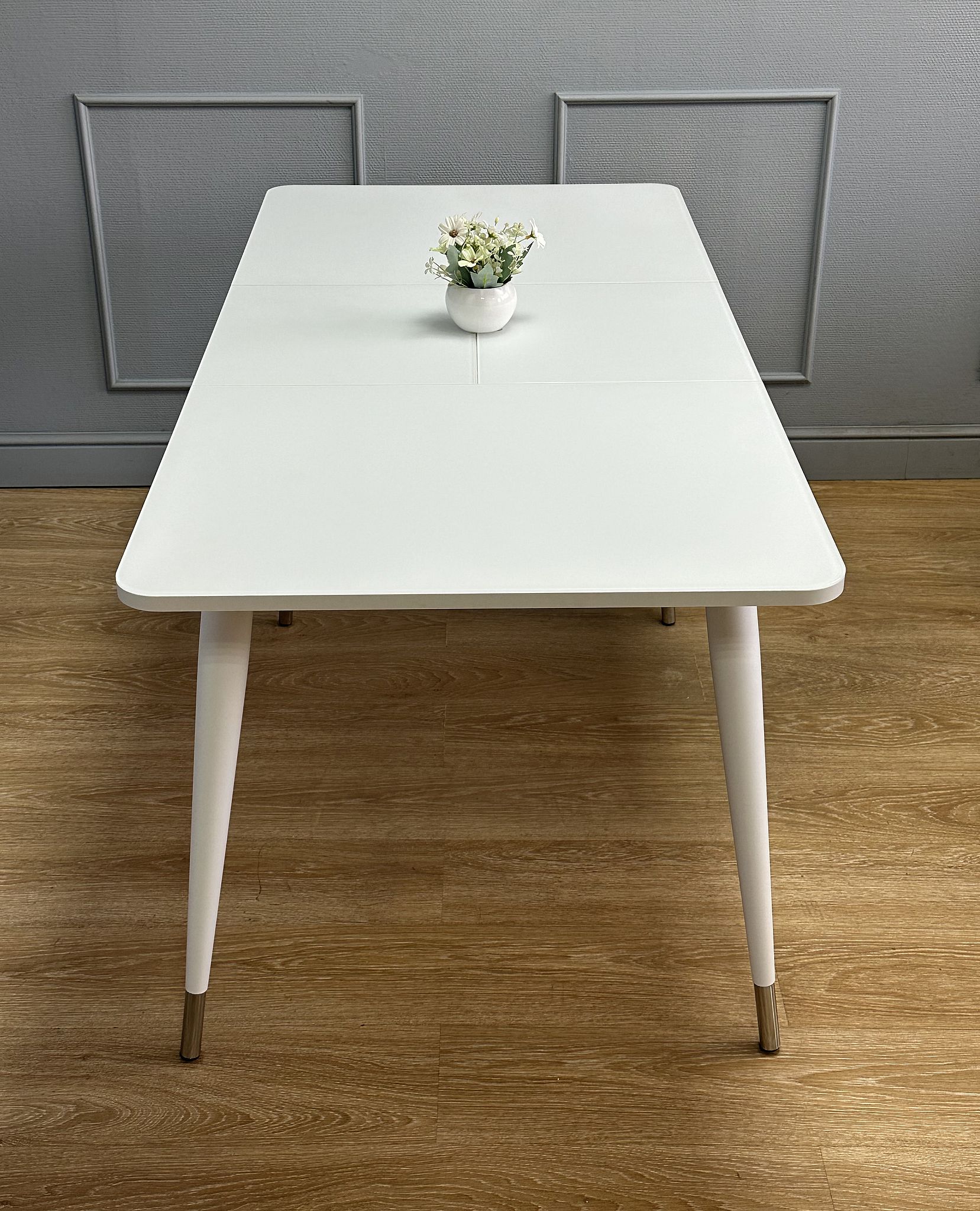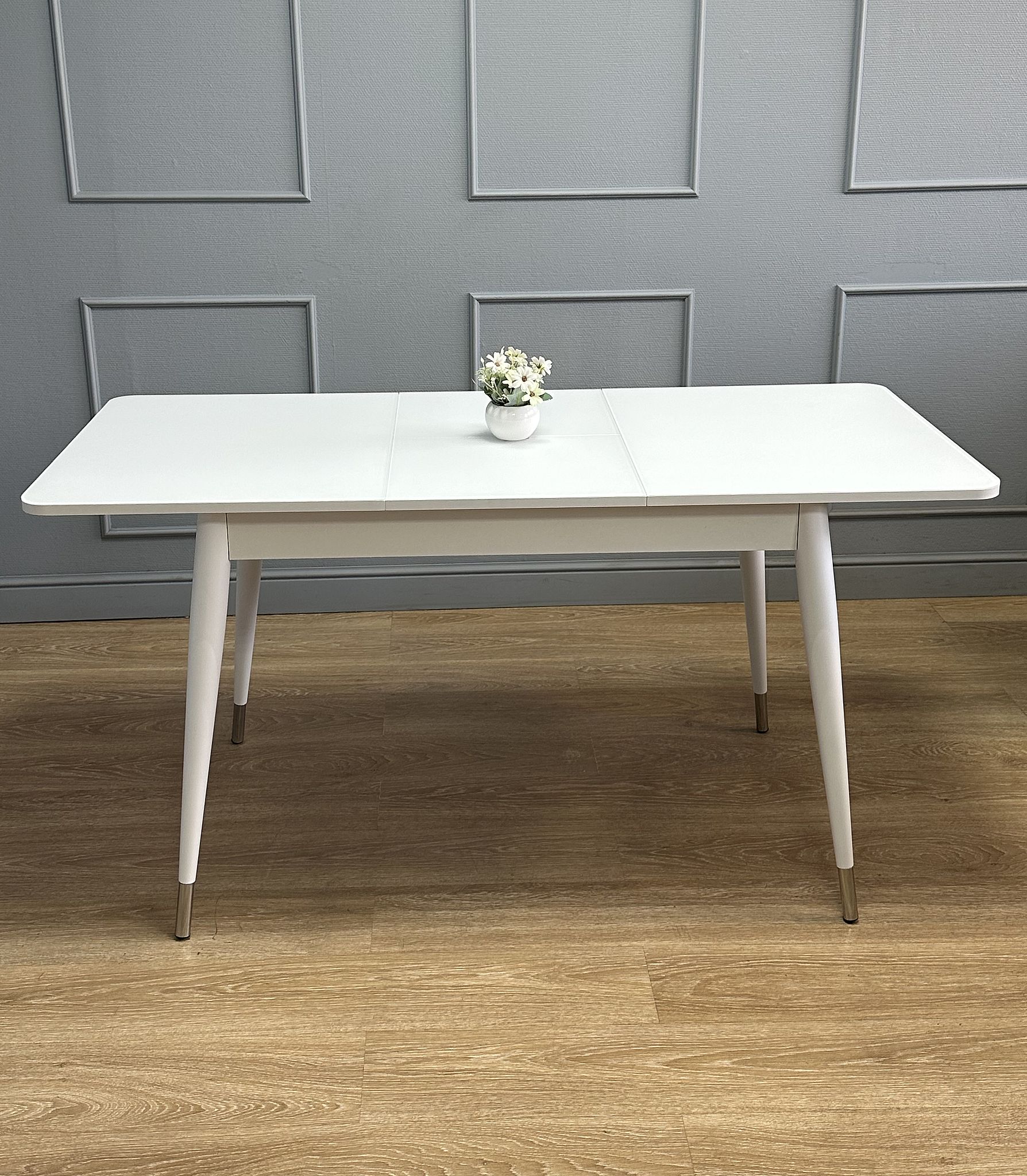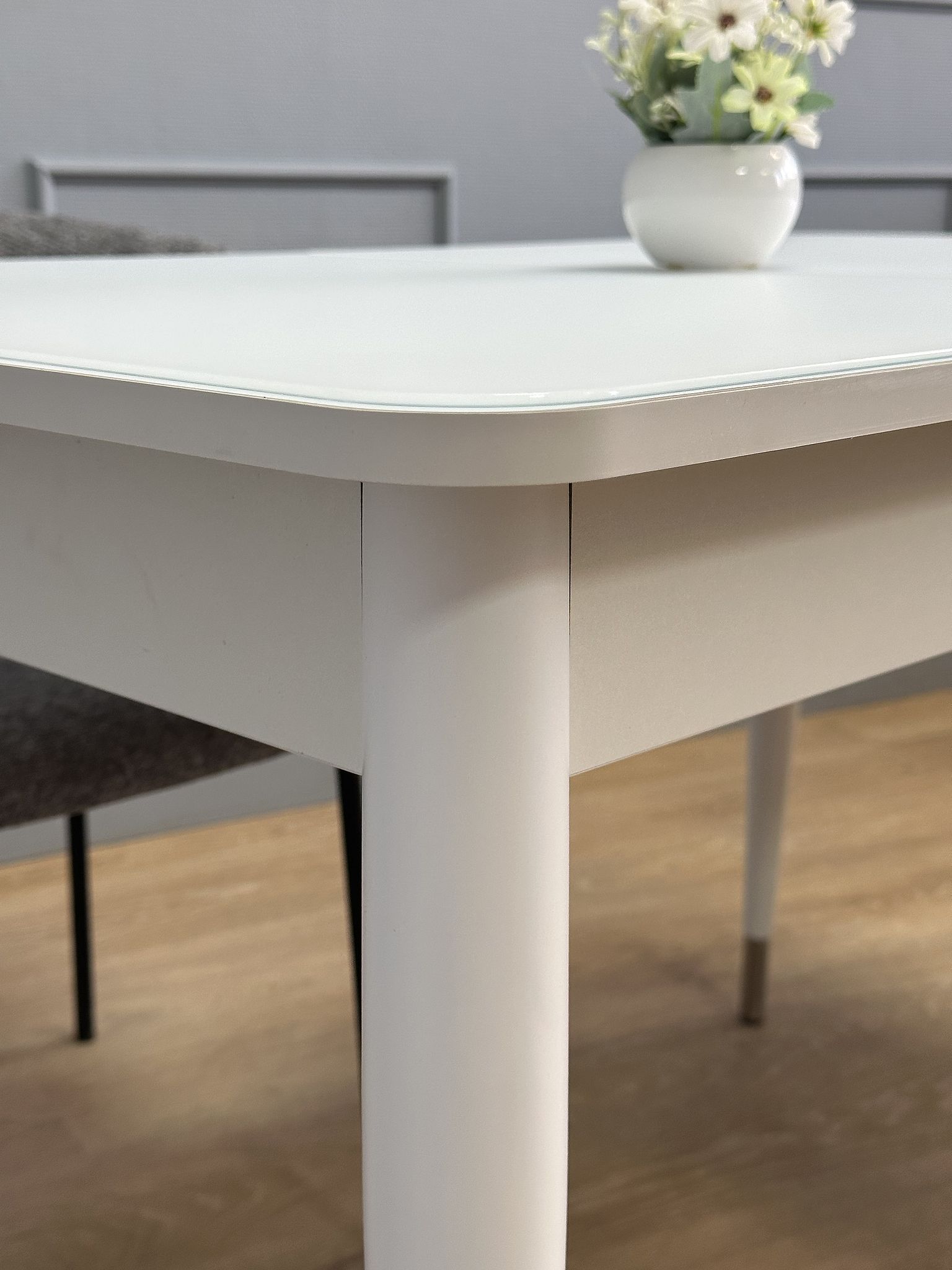 Стол со стеклом прекрасно выглядит и всегда идеально сочетается с белыми элементами, которые есть на каждой кухне. Он надежен, устойчив, с теплыми деревянными опорами.