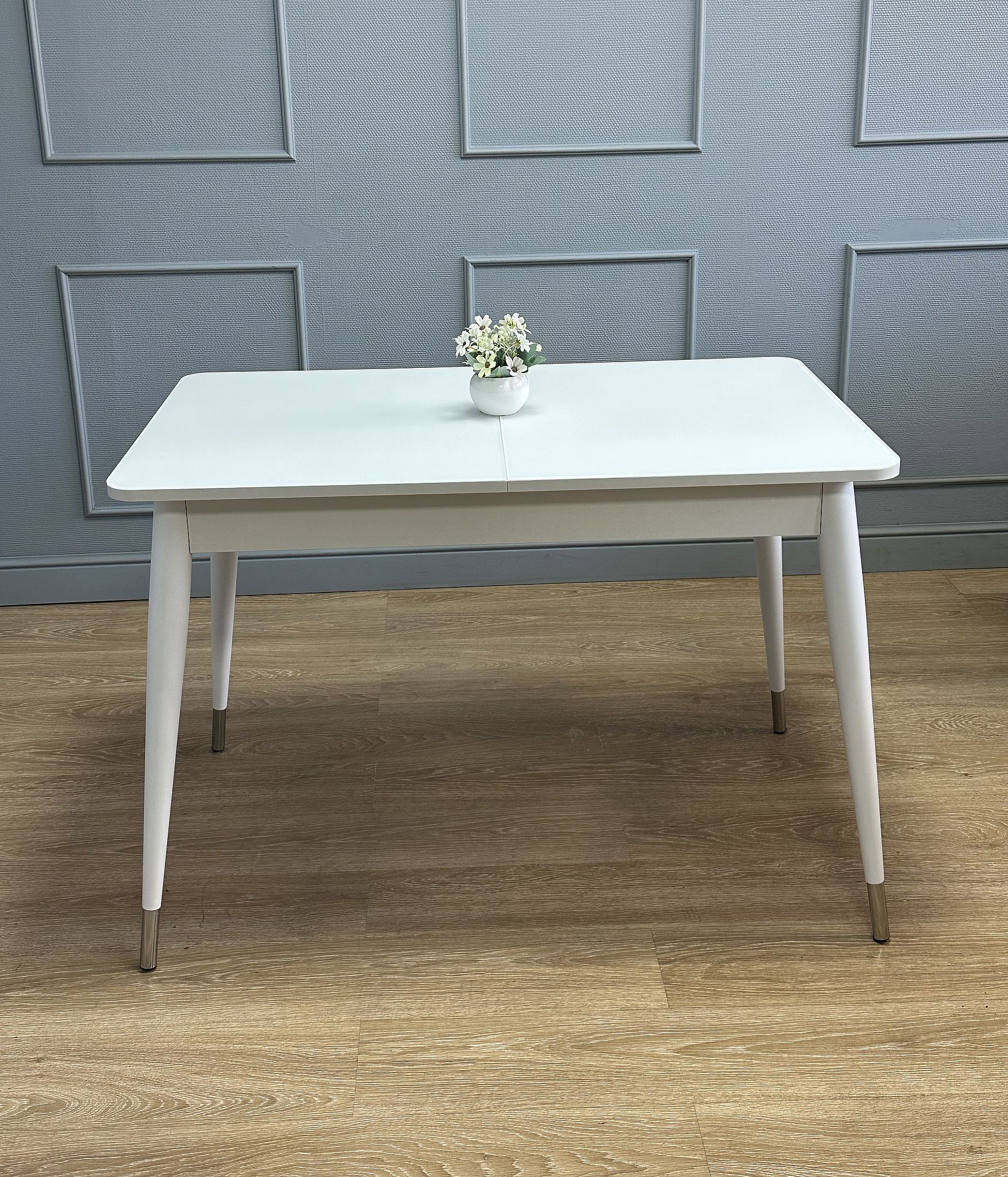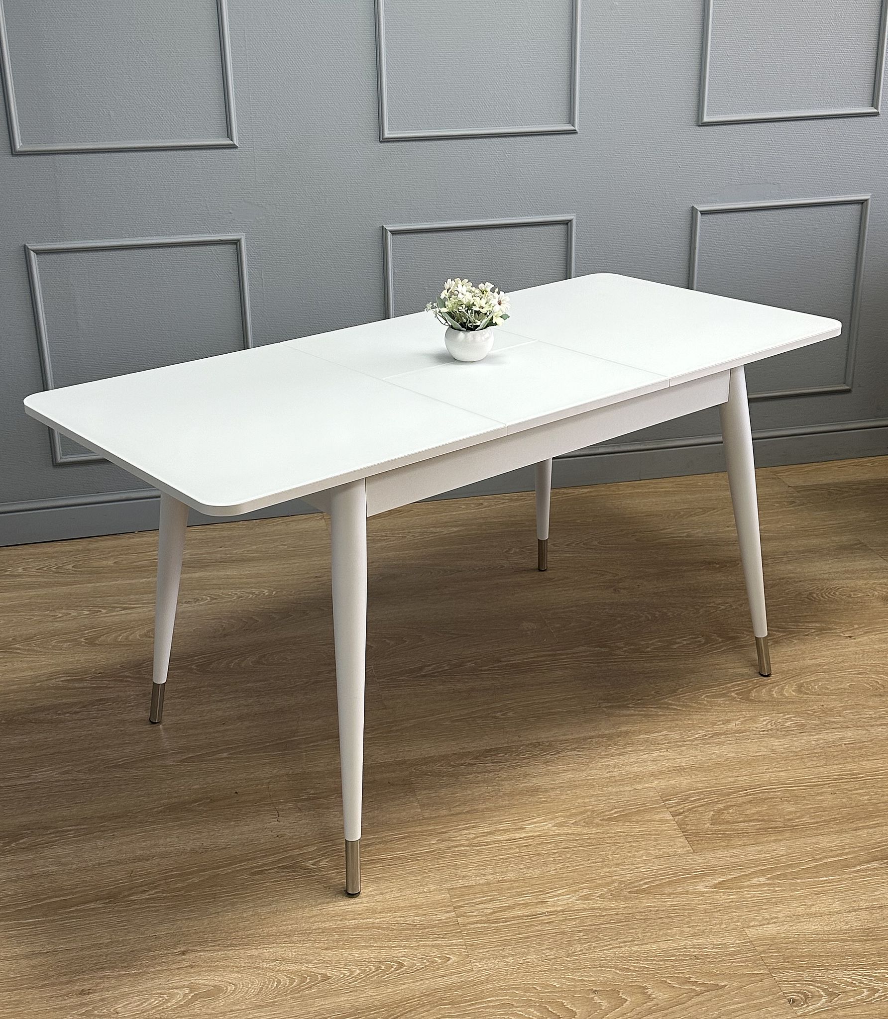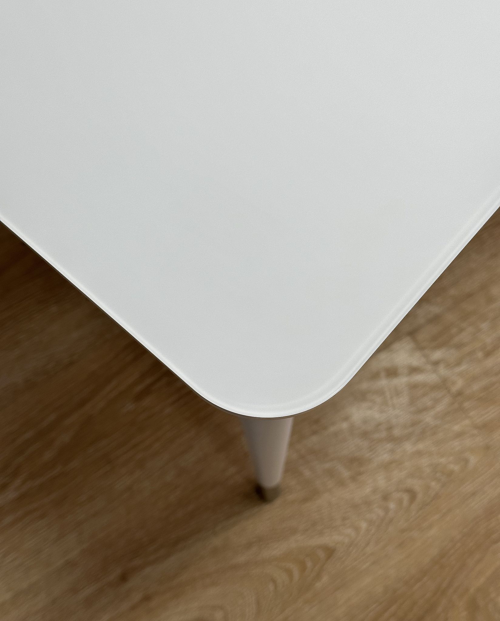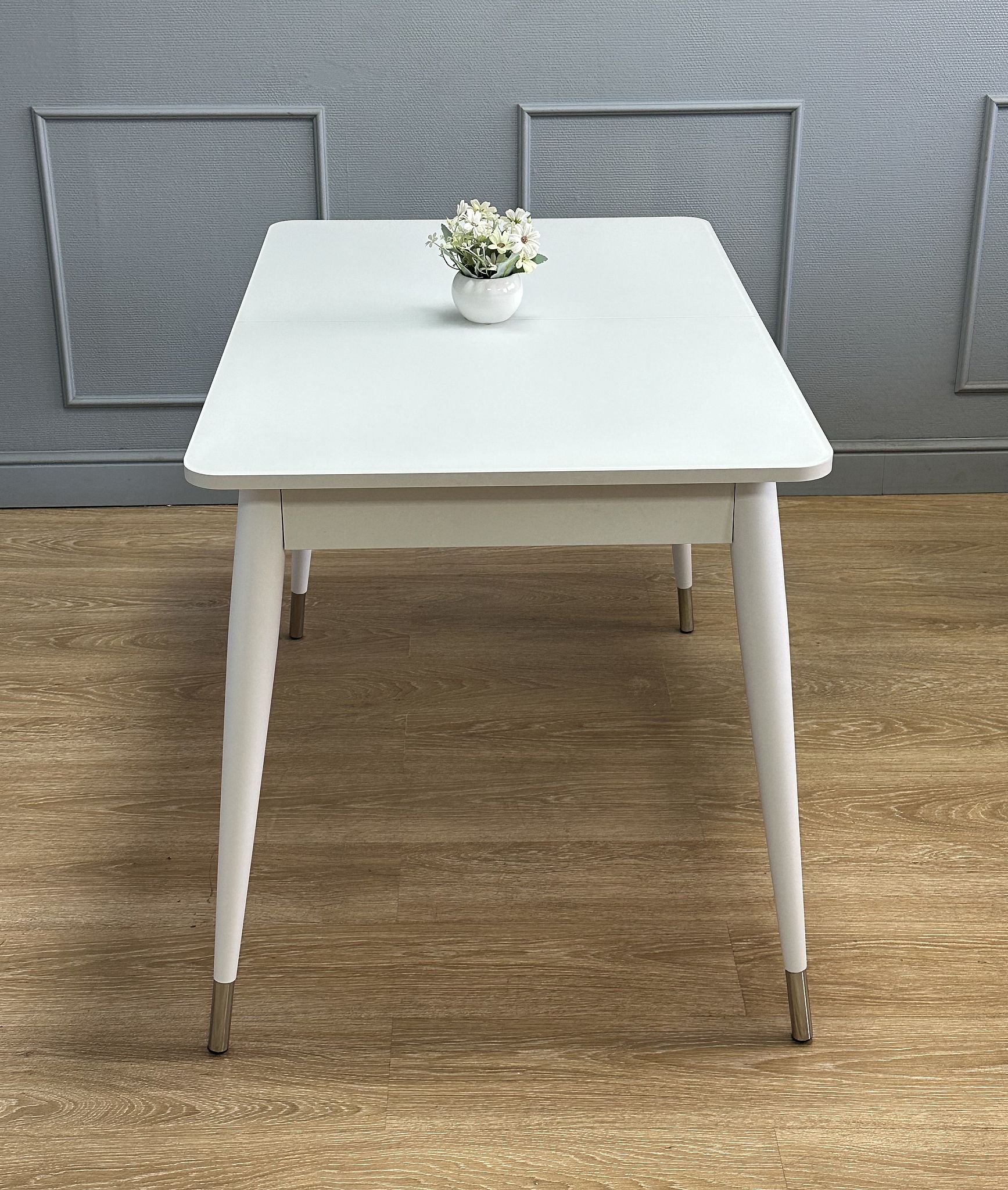 Стол со стеклом прекрасно выглядит и всегда идеально сочетается с белыми элементами, которые есть на каждой кухне. Он надежен, устойчив, с теплыми деревянными опорами.