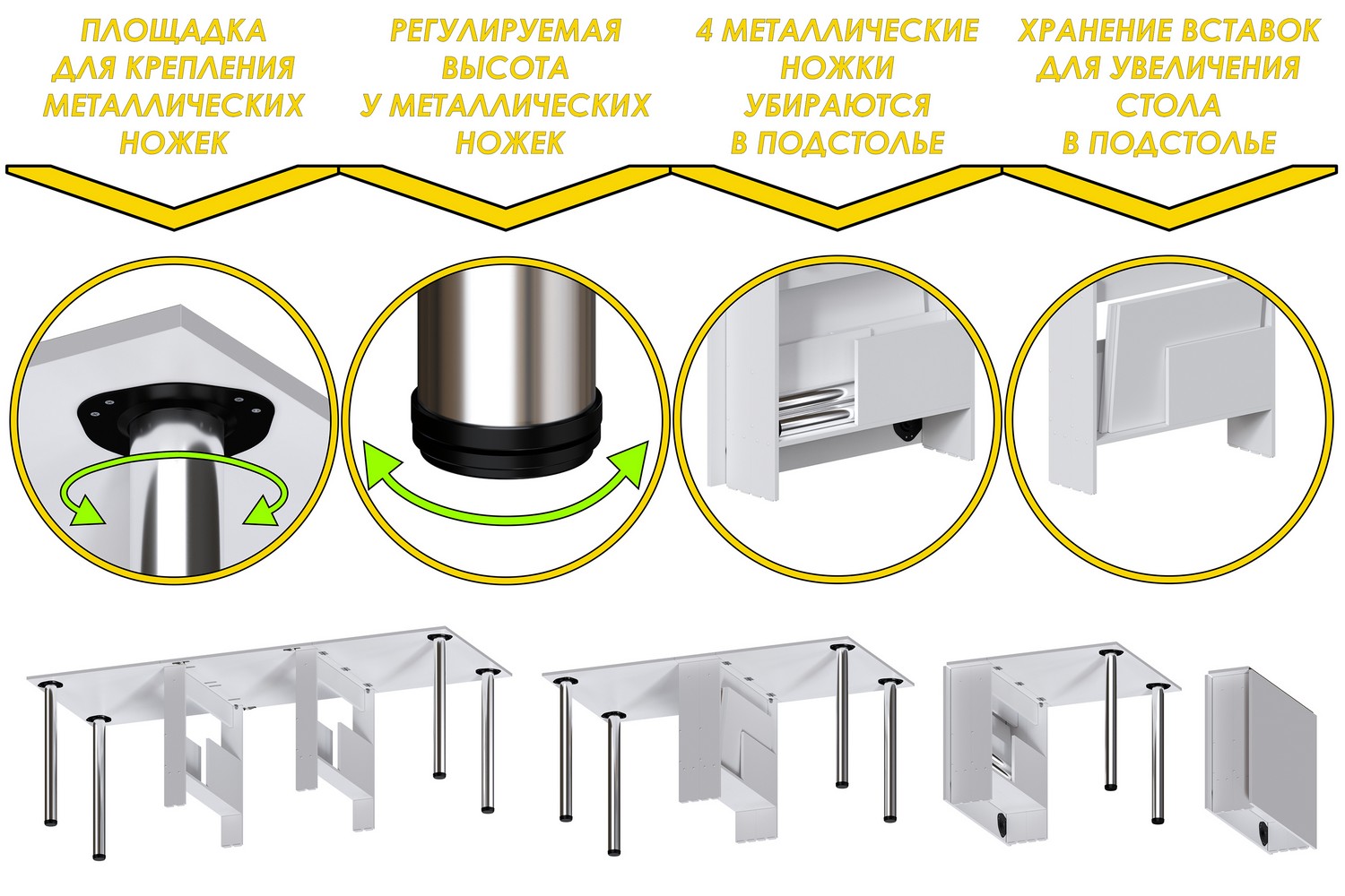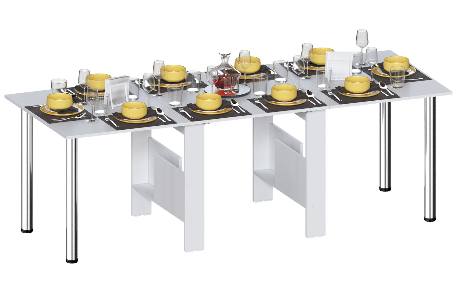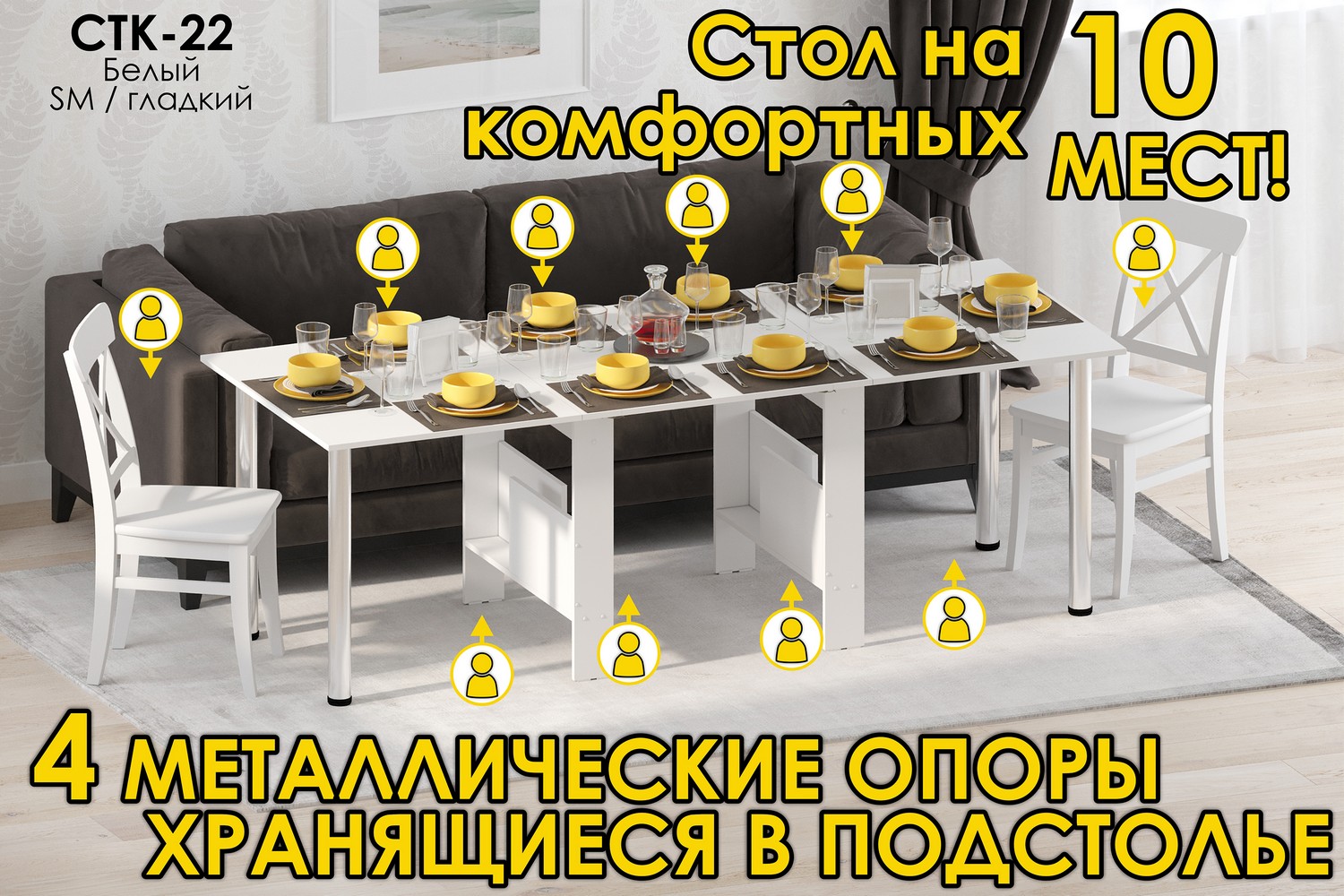 Большой прямоугольный раскладной стол СТК-22 готов принять много гостей, разместиться за столом смогут 12 человек. Если нужно ещё больше, то можно поставить впритык ещё один стол. Цвет Дуб молочный. Максимальная длина столешницы 223.4 см. Другие варианты раскладки стола: 164 см, 95 см, 25.8 см. В максимально сложенном виде получается небольшая тумба, что позволит без труда найти место для хранения такого большого стола. Столешница и подстолье из ЛДСП 16 мм. Крайние ножки металлические, с регулировкой высоты - это позволяет компенсировать неровность пола при необходимости. Поставляется в разобранном виде.