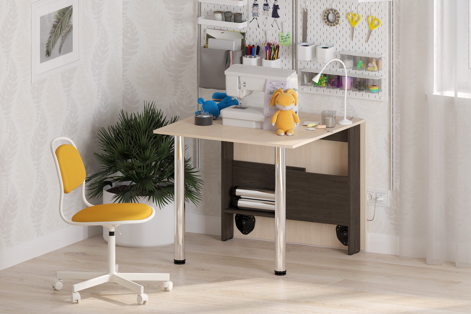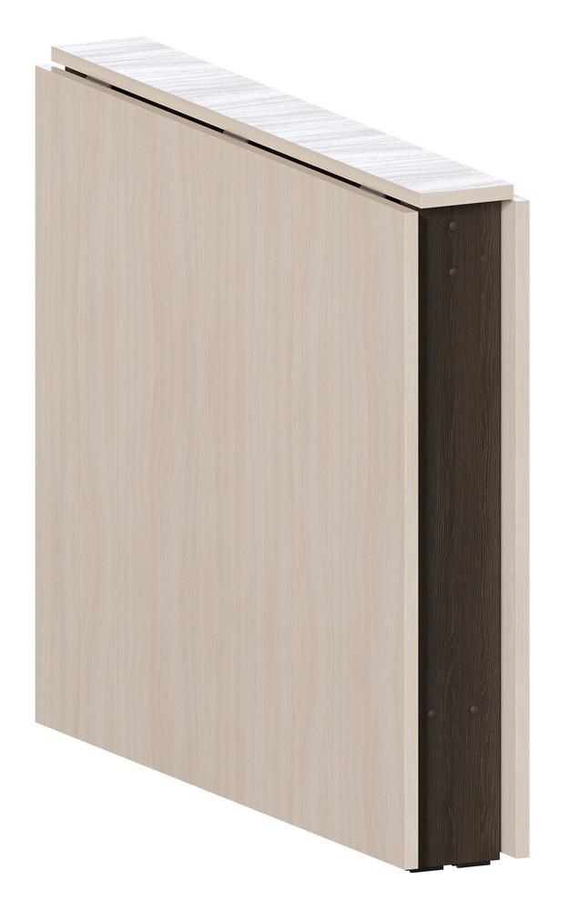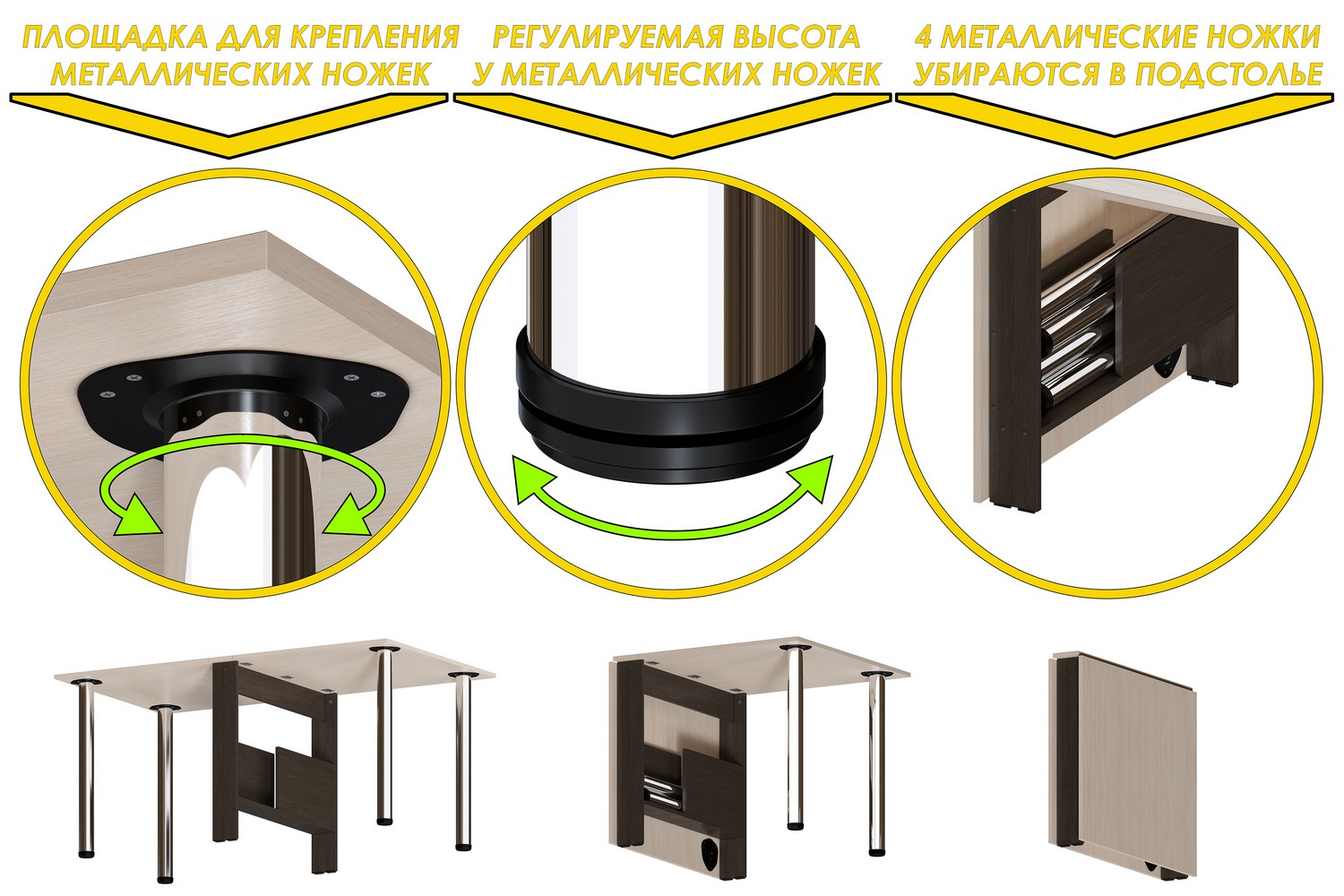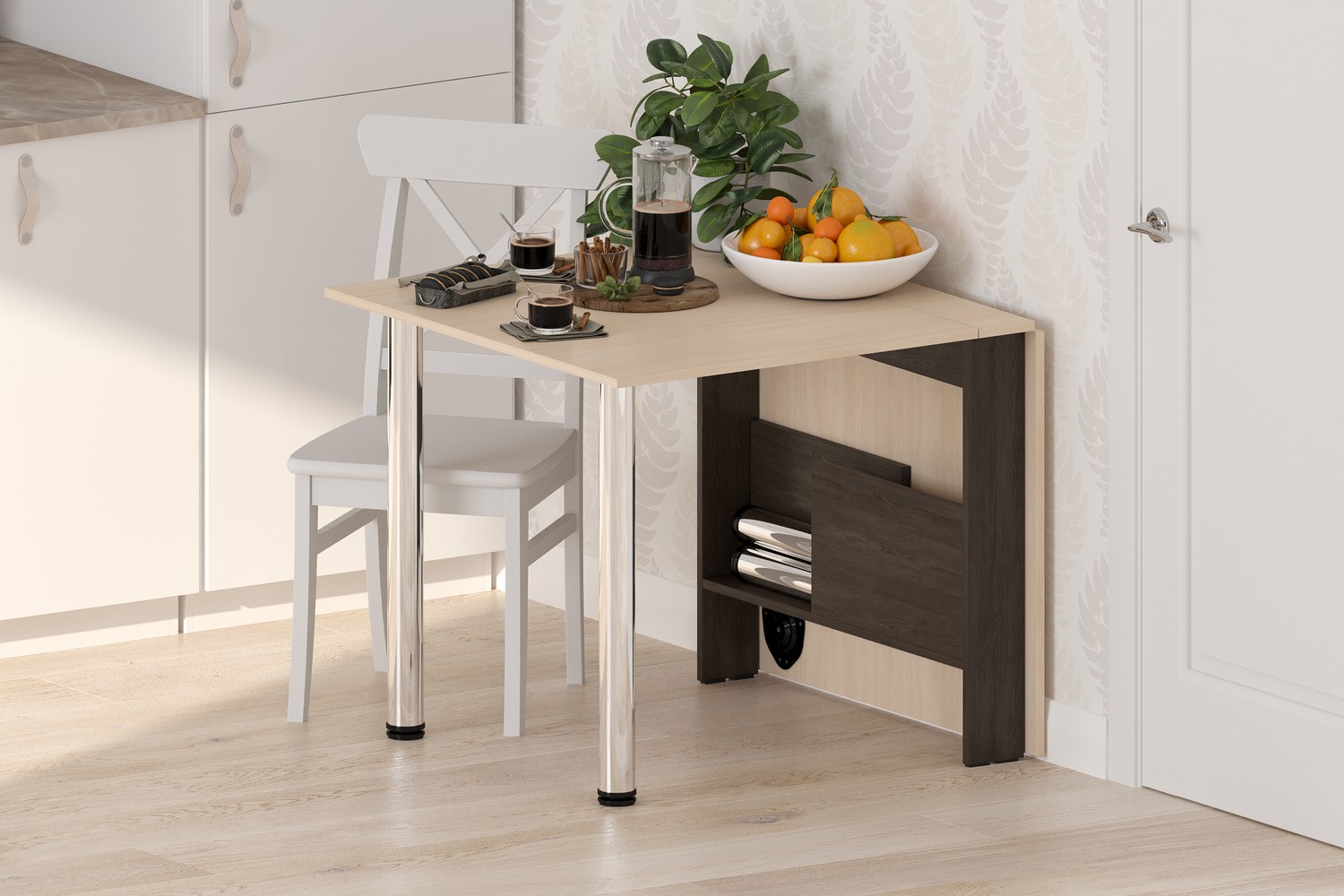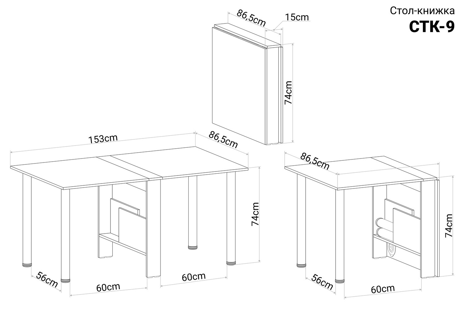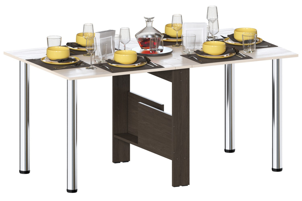 Компактный стол-книжка с металлическими ножками. Длина столешницы 153 см в разложенном виде, ширина 86.5 см. За столом могут комфортно разместиться 6 человек. При этом в сложенном виде длина стола всего 15 см! Легко найти место для хранения. Металлические ножки съёмные и для них предусмотрены места для хранения под столешницей. Металлические ножки также оснащены регулировкой по высоте. Цвет стола Дуб молочный, материал: ЛДСП 16 мм. Поставляется в разобранном виде.
