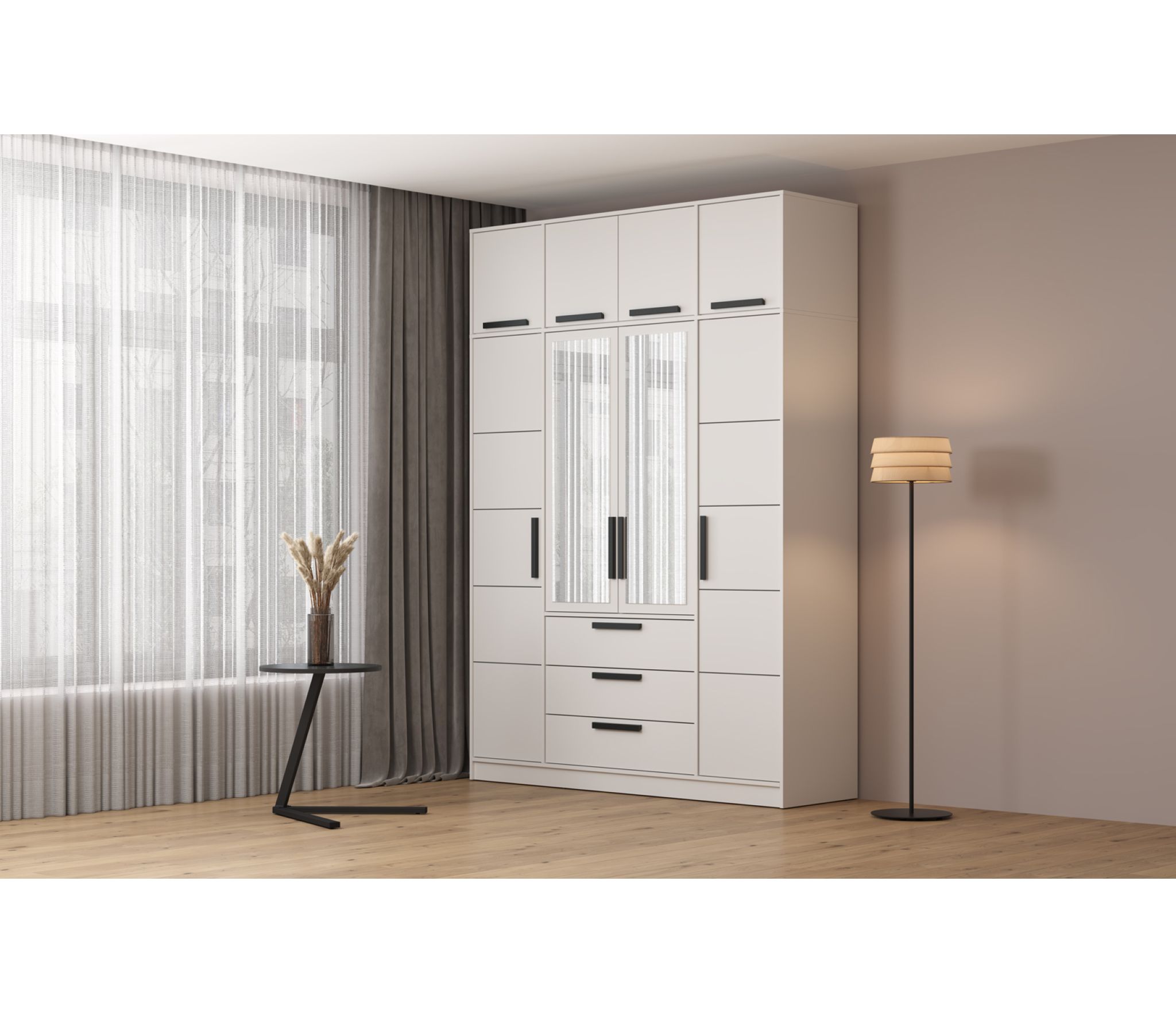 за четырьмя распашными дверцами. Фасад ценральных дверей шкафа - с зеркалом.